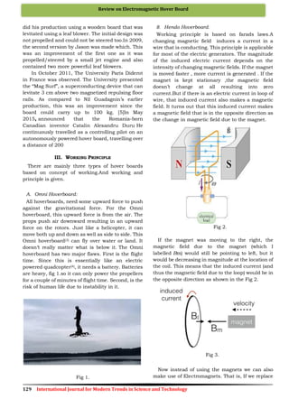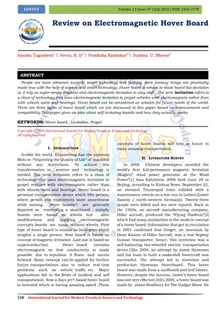 The document reviews the concept and technological advancements of electromagnetic hoverboards, highlighting their reliance on magnetic levitation for personal transportation. It classifies hoverboards into three types: omni, hendo, and lexus, each utilizing different principles of levitation and propulsion. The paper emphasizes the potential of hoverboards to solve future transportation challenges and discusses ongoing research in the field.
