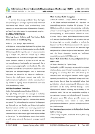 This document reviews key-based encryption schemes for secure data sharing on cloud. It discusses how traditional encryption techniques are not suitable for large scale data sharing due to complex key management. A key-based encryption scheme is proposed that allows a data owner to generate an aggregate encryption key and submit a single aggregate trapdoor for keyword search. This reduces key management complexity and the number of trapdoors needed compared to traditional techniques. The proposed scheme uses seven polynomial algorithms for security including key generation, encryption, key extraction and trapdoor generation. It aims to provide an effective solution for secure and scalable data sharing using cloud storage.