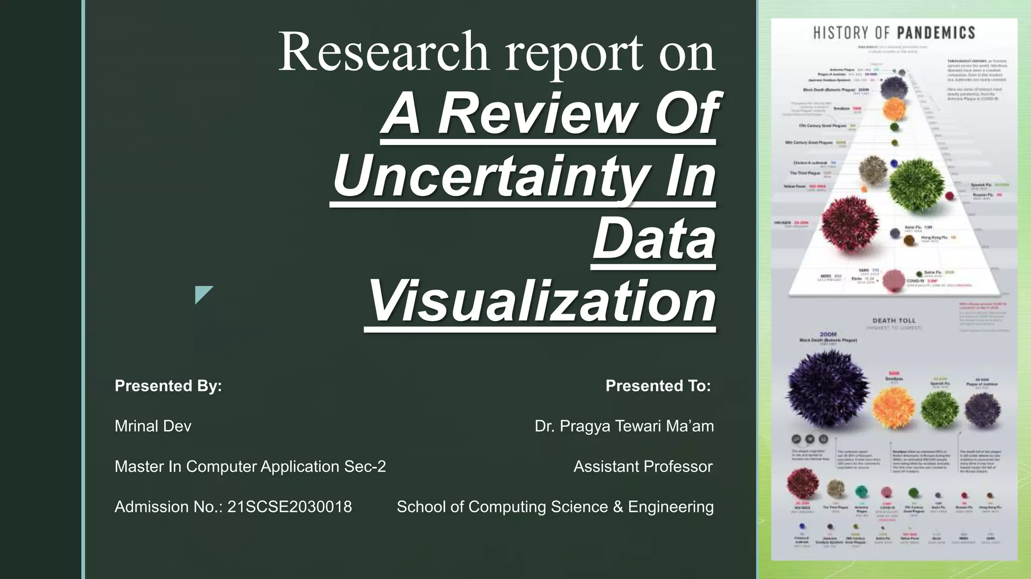 The research report explores the complexities of uncertainty in data visualization, emphasizing the balance between artistic and scientific elements to effectively convey data. It discusses the nature of uncertainty, its representation in visual analytics, and methodologies like visual semiotics and frequency farming for better understanding. The document highlights the importance of accurately representing uncertainty to enhance viewer interpretation and decision-making.