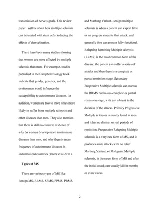 Stem cells, particularly autologous stem cells extracted from a patient's own bone marrow, show promise in treating multiple sclerosis (MS). Studies have found autologous stem cell transplantation after immunosuppression can reduce progression of MS, especially for patients with relapsing-remitting MS rather than primary progressive MS. While stem cells may not cure MS completely, they can help regenerate myelin sheaths and slow the degenerative effects of the disease on the nervous system. More research is still needed but stem cell therapy offers new opportunities for delivering high doses of immunosuppression to potentially stop MS progression.