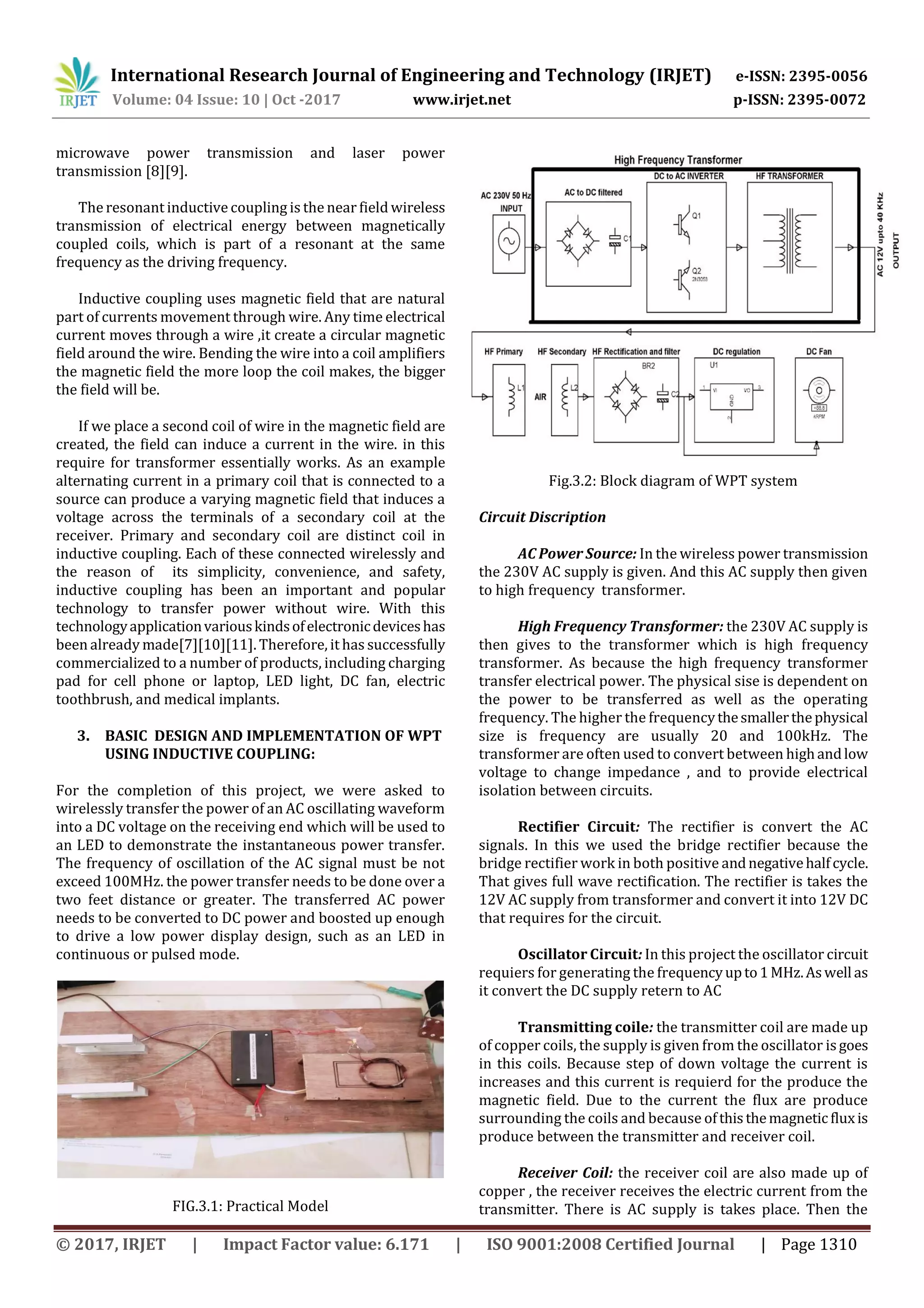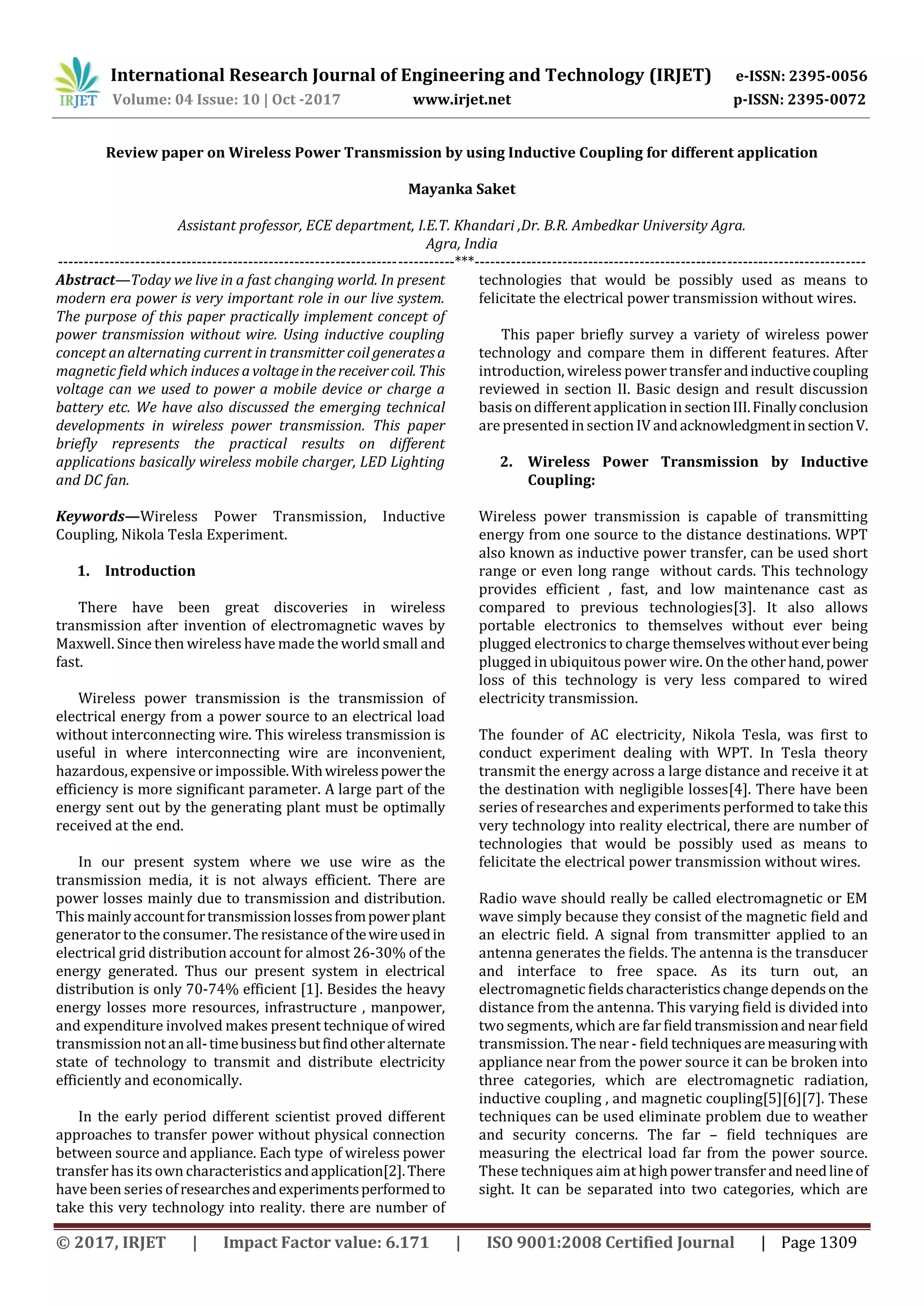 This document summarizes wireless power transmission using inductive coupling for different applications. It discusses how an alternating current in a transmitter coil generates a magnetic field which induces a voltage in a receiver coil. This induced voltage can be used to power mobile devices or charge batteries wirelessly. The document then reviews inductive coupling technology and compares various wireless power transfer methods. It presents practical results of a wireless mobile phone charger, LED lighting, and a DC fan operating without wires by using inductive coupling to transmit power. The document concludes that wireless power transmission through inductive coupling is an efficient means of transferring power without wires and has many potential applications.