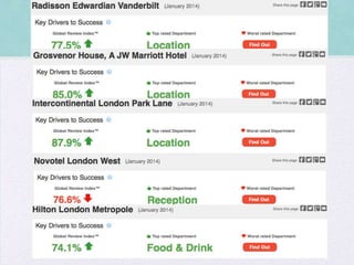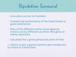 This document discusses online reputation management services and compares ReviewPro to TripAdvisor. ReviewPro aggregates reviews from more sources globally than TripAdvisor. It also provides a more complete analysis for hotels. ReviewPro is considered more important for hotels than TripAdvisor because it has more data from different sources and opinions beyond just TripAdvisor, giving hotels a better overview of their reputation online. The document also analyzes reviews on TripAdvisor and OTA sites for several hotels in London.