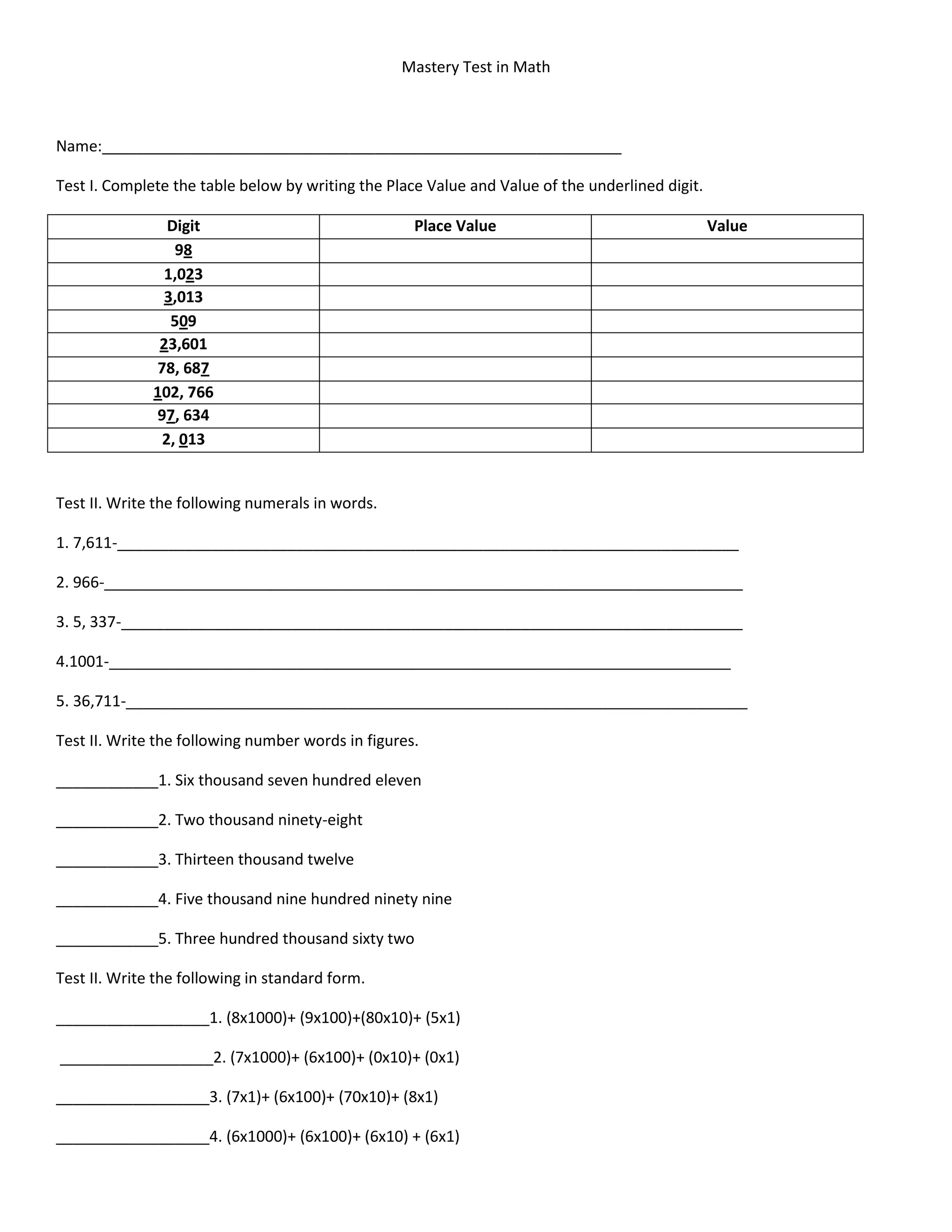 This document contains a mastery test on math skills including place value, writing numbers in words and figures, comparing and ordering numbers, rounding numbers, and converting between Hindu-Arabic and Roman numerals. The test has 10 sections with multiple questions in each section testing a range of math concepts up to the ten thousands place value.