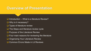 The document outlines the purpose and methodology of conducting a literature review, emphasizing its significance in academic research. It describes various types of literature reviews, essential steps in the literature review cycle, and common mistakes to avoid. A well-structured literature review serves to provide foundational knowledge, highlight research gaps, and justify the relevance of the current study.
