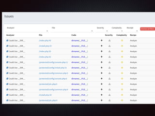 The document discusses static analysis of PHP code, highlighting the challenges of reviewing unknown code without running or understanding it, emphasizing the need for tools to query structured source code. It details various tools and methods for analyzing PHP code, migration between versions, and best practices for maintaining code quality. The speaker, Damien Seguy, presents insights into automated code review, issues identified through static analysis, and metrics related to code complexity and structure.