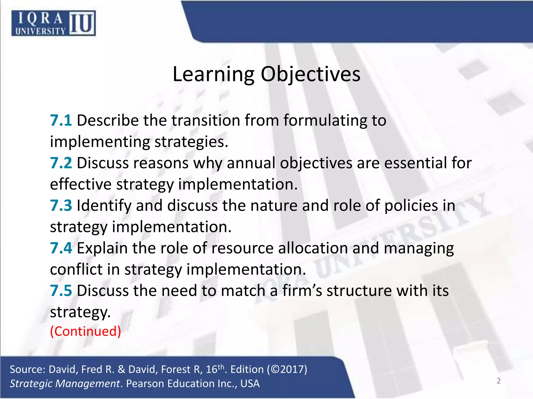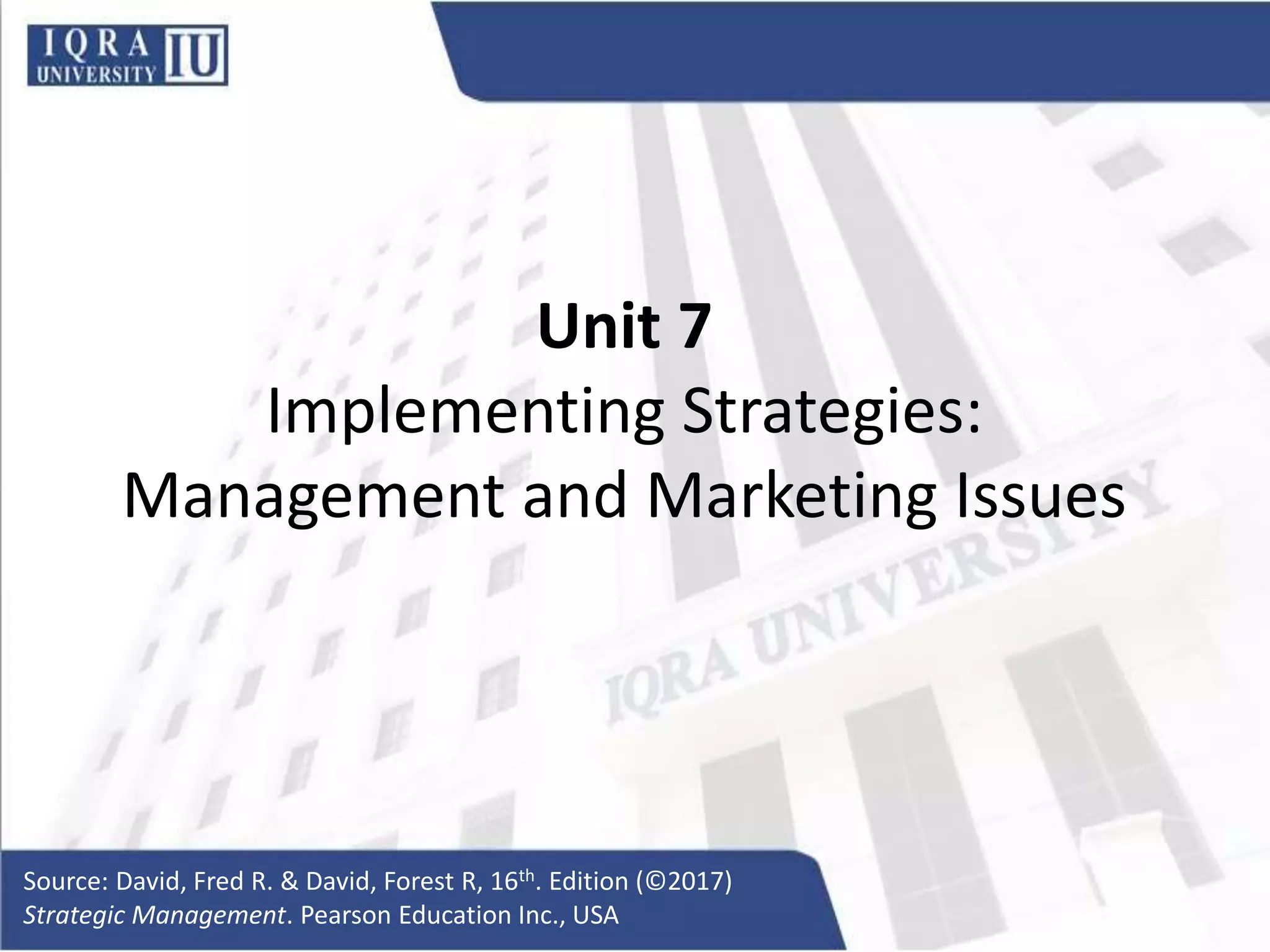 This document outlines learning objectives and content for a unit on implementing strategies and related management and marketing issues. It discusses transitioning from strategy formulation to implementation, setting annual objectives, establishing policies, allocating resources, managing conflict, matching organizational structure to strategy, and addressing human resource and marketing issues. Types of organizational structures are defined including functional, divisional, strategic business unit, matrix, and ways to restructure.