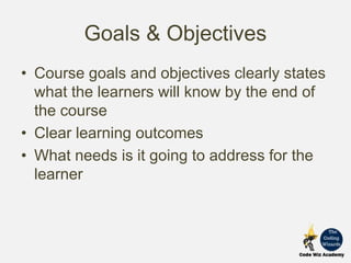 The document outlines the goals and objectives for CodeWiz Academy courses, emphasizing clear learning outcomes, high-quality content, and the need for flexible course design that accommodates diverse learning paths. It highlights the importance of unbiased learning materials and consistent assessment strategies to evaluate student progress. Additionally, it warns of a domino effect in the development process, where delays can negatively impact subsequent steps.