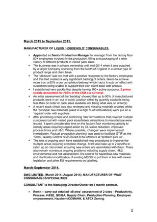 This document provides a summary of David Ian Booth's qualifications and experience in production, manufacturing, and continuous improvement. It outlines over 30 years of experience leading projects across various industries, with expertise in implementing methodologies like Lean, Six Sigma, 5S, and more. Recent roles include serving as Senior Production Manager for a manufacturer of household consumables and conducting a consultancy focusing on improvement.