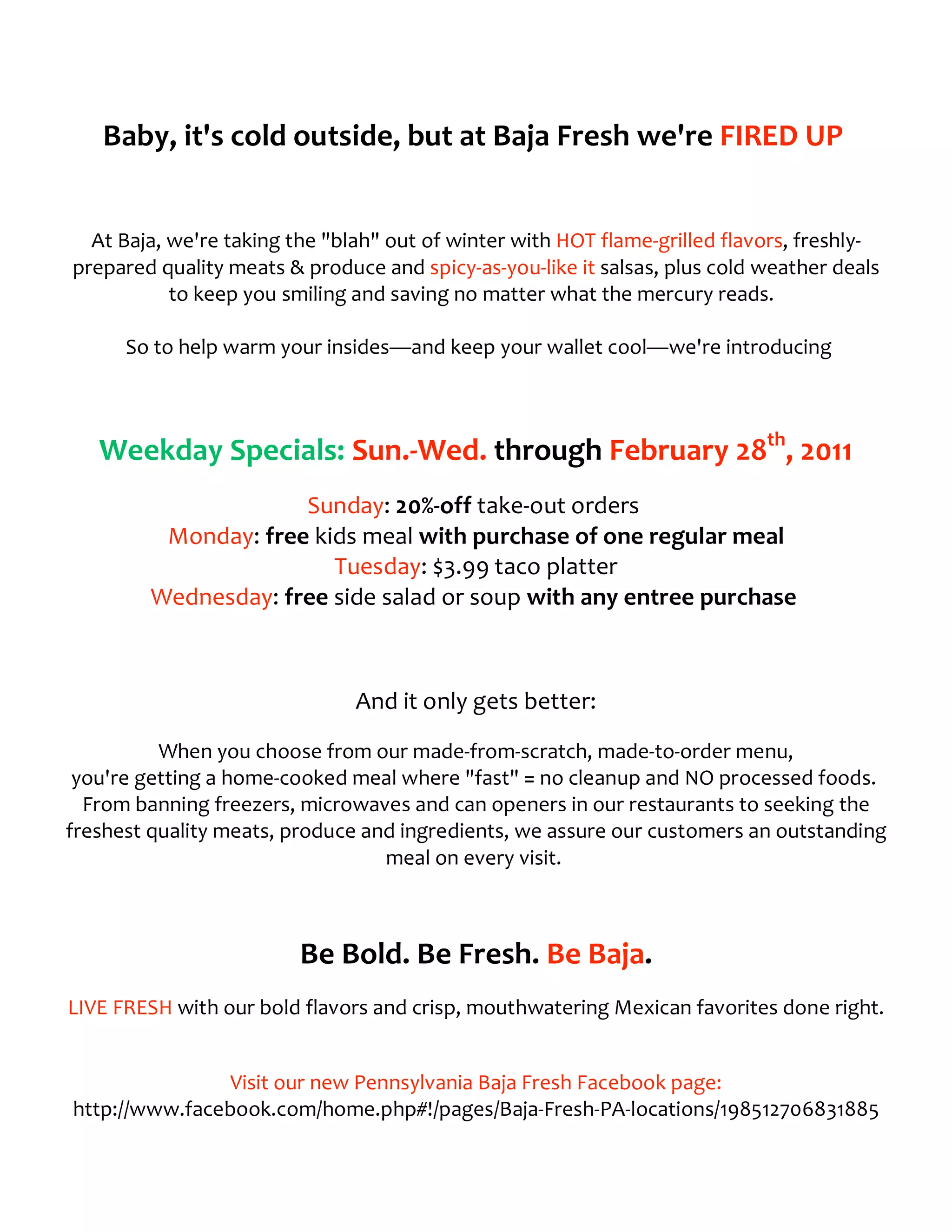 The document announces weekday specials from Sunday to Wednesday at Baja Fresh restaurants from January to February 2011. These specials include 20% off take-out on Sundays, a free kid's meal with purchase of one regular meal on Mondays, a $3.99 taco platter on Tuesdays, and a free side salad or soup with any entree purchase on Wednesdays. It also promotes Baja Fresh's made-from-scratch menu using fresh, high-quality ingredients without processed foods.
