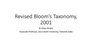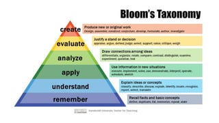 The document discusses Bloom's Taxonomy, which organizes learning objectives into six levels of cognitive complexity - Remember, Understand, Apply, Analyze, Evaluate, and Create. It provides examples of learning objectives for each level related to nouns and the Indian parliament. The objectives examples move from basic recall of facts to more complex tasks like critical thinking, problem-solving, and creation of new ideas. The document advises avoiding vague objectives that do not clearly articulate the specific cognitive process required.