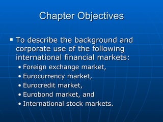 This document provides an overview of international financial markets, including the foreign exchange market, eurocurrency market, eurocredit market, eurobond market, and international stock markets. It discusses the history and development of each market, how they work, key participants, and motives for companies and investors to use these global financial systems. The markets allow multinational corporations to raise funds, invest globally, and facilitate international trade and currency exchange.