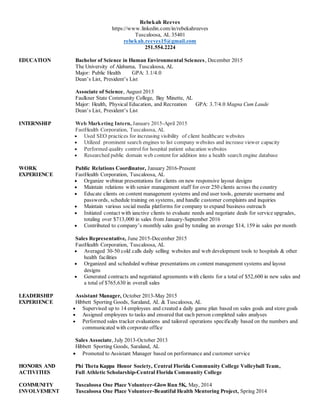 This document is a resume for Rebekah Reeves detailing her education, internship experience, work experience, leadership experience, honors, and community involvement. She received a Bachelor's degree in Public Health from the University of Alabama and an Associate's degree from Faulkner State Community College. Her internship and work experience includes positions in web marketing, public relations, and sales for FastHealth Corporation. She also has experience supervising employees as an Assistant Manager at Hibbett Sporting Goods. Rebekah has been involved with her community through volunteering with Tuscaloosa One Place.