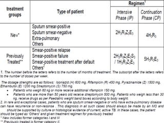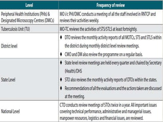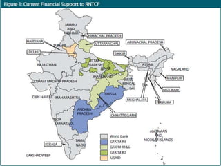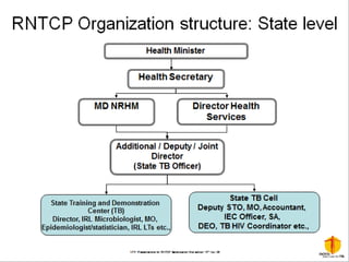 This document provides an overview of tuberculosis (TB) control in India. It discusses the background and epidemiology of TB globally and in India. It describes India's National TB Control Programme established in 1962 and the Revised National TB Control Programme (RNTCP) launched in 1997, which applies the WHO-recommended DOTS strategy. The RNTCP aims to achieve 85% treatment success among new sputum-positive TB patients and detect at least 70% of estimated cases. It emphasizes standardized treatment regimens, quality-assured diagnosis, and direct observation of treatment.