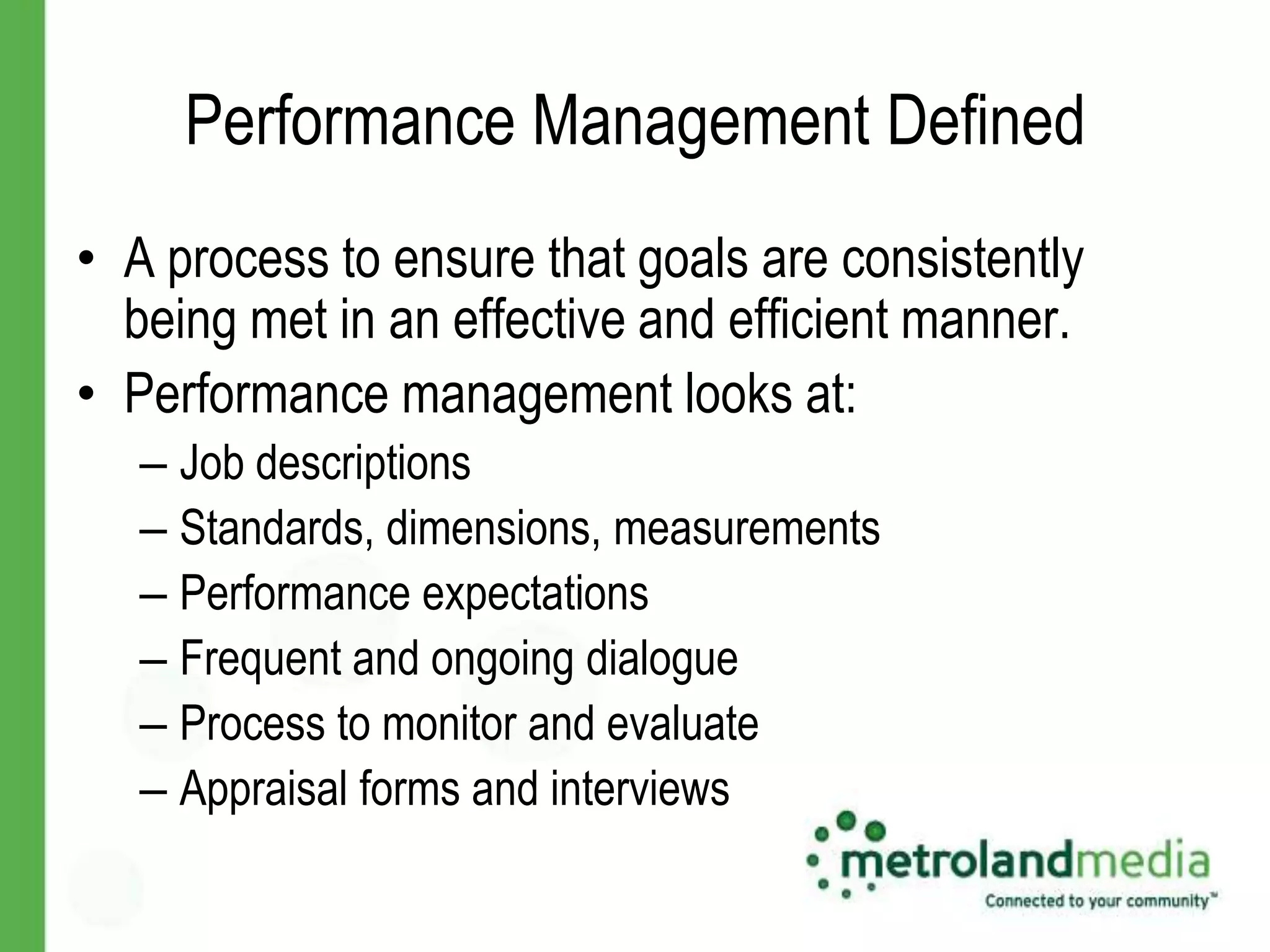This document provides an overview of performance reviews and management. It discusses that performance management is a process to ensure goals are met efficiently by looking at job descriptions, standards, expectations, ongoing dialogue, evaluation, and appraisal forms. It aims to achieve organizational outcomes, promote competent employees, improve marginal performance, help poor performers, and terminate chronic non-performers. The purpose is also to align individual goals with corporate objectives, increase manager-employee communication on performance, and identify employee strengths and areas for improvement in a fair and consistent manner. However, most traditional performance management systems are flawed as they rate too many employees as average or above average and do not provide tools to address poor performance or critical feedback. The document advocates for an alternative