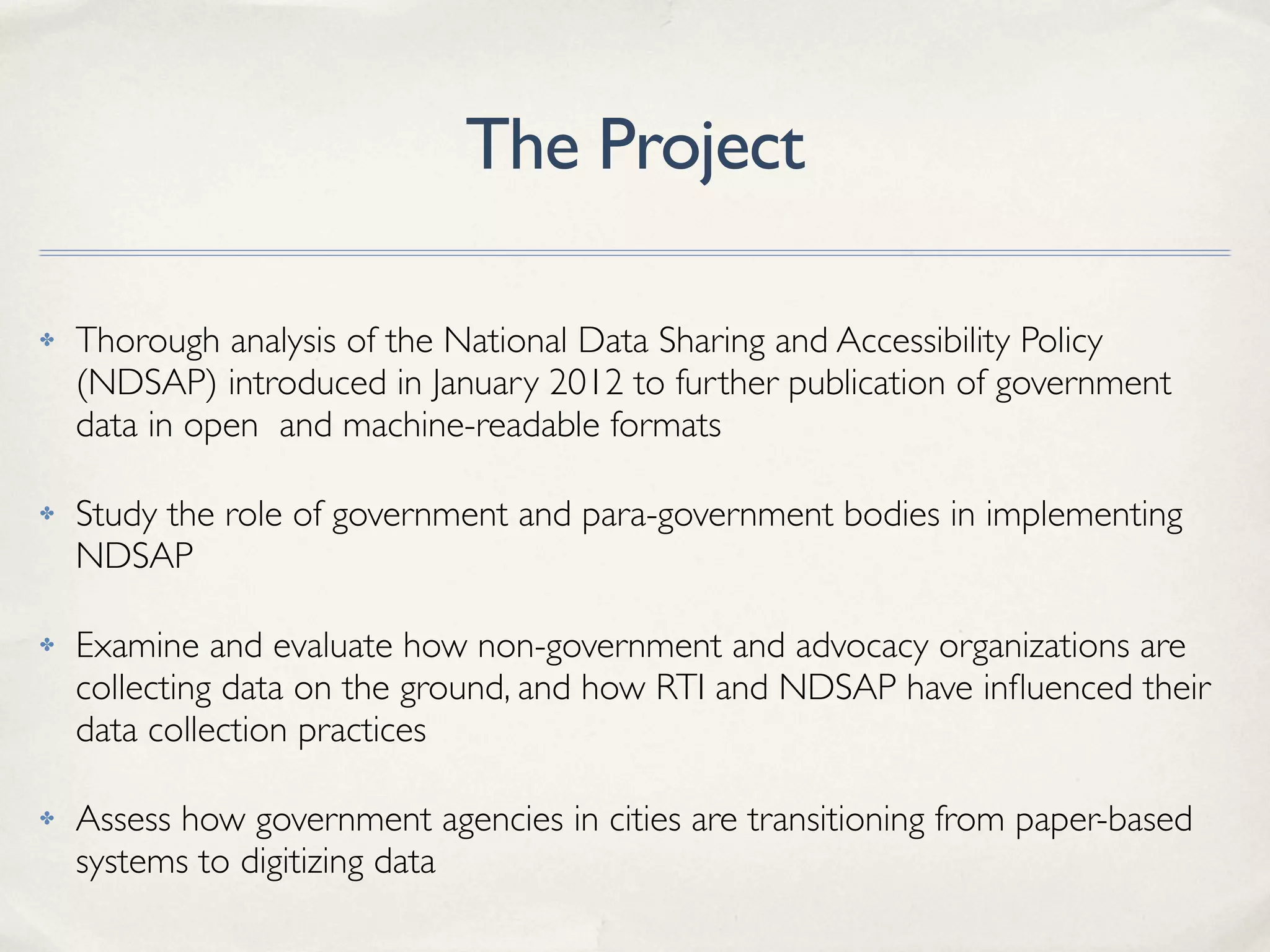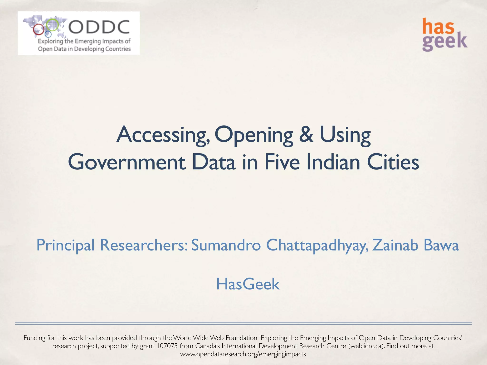 This document summarizes a research project on accessing, opening, and using government data in five Indian cities. The project will analyze India's National Data Sharing and Accessibility Policy, study how government and non-government organizations are implementing open data practices, and assess challenges around digitizing legacy paper records. Interviews will be conducted with officials and advocates to understand how different actors are negotiating access to data and what data collection efforts are underway.