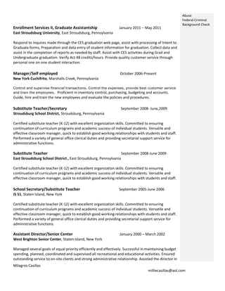 The document provides a summary of Milagros Casillas' qualifications and experience. It includes her objective to coordinate instructional technology programs. It then outlines her education background including degrees in information technology, business education, and secretarial science. The bulk of the document lists her work experience in roles such as graduation coordinator, graduate assistant, manager, substitute teacher, assistant director, and Spanish teacher. It also includes a list of skills, activities, awards and languages.