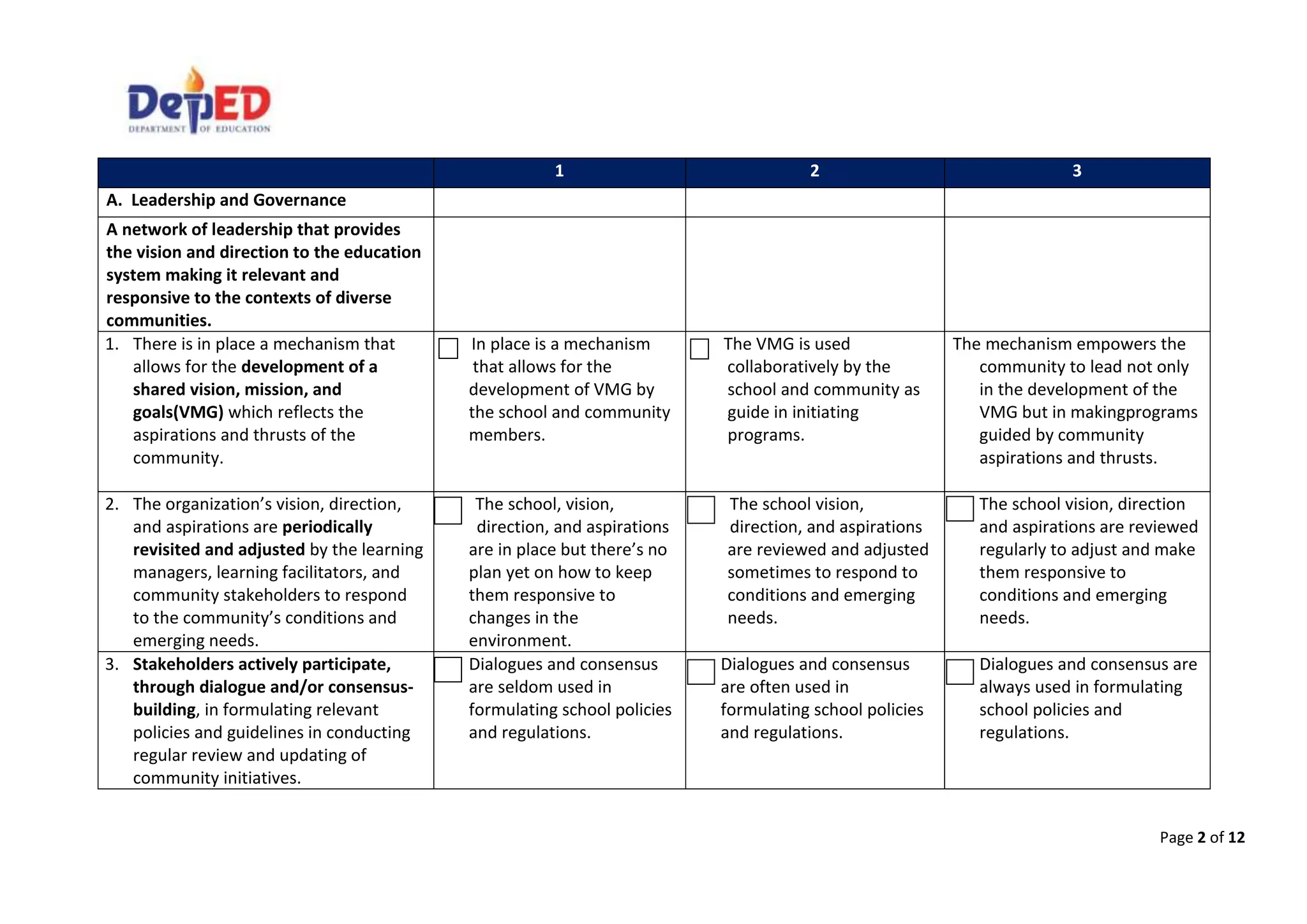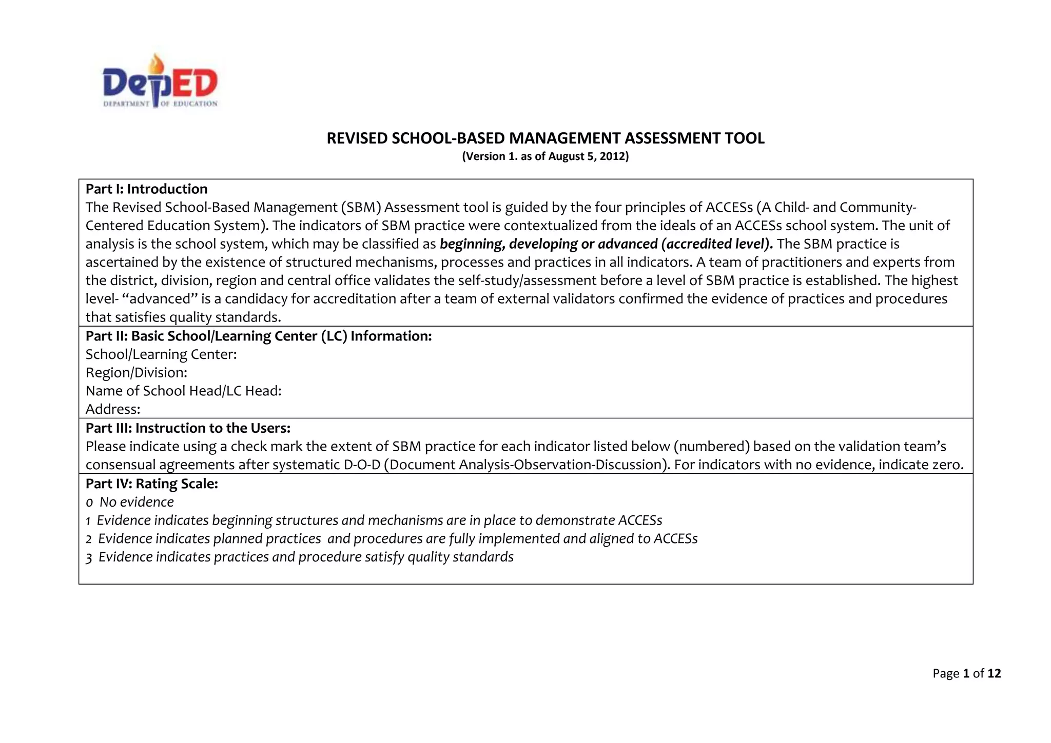 The document provides a tool for assessing school-based management practices. It outlines four principles of school management: Leadership and Governance, Curriculum and Learning, Accountability and Continuous Improvement, and Management of Resources. Each principle contains several indicators that are rated on a scale from 0 to 3 based on evidence collected through document analysis, observation, and discussion. The ratings are used to determine the level of school-based management practice as beginning, developing, or advanced/accredited. Community stakeholders are involved in validating the self-assessment results. The highest rating of practices satisfying quality standards can qualify a school for accreditation.