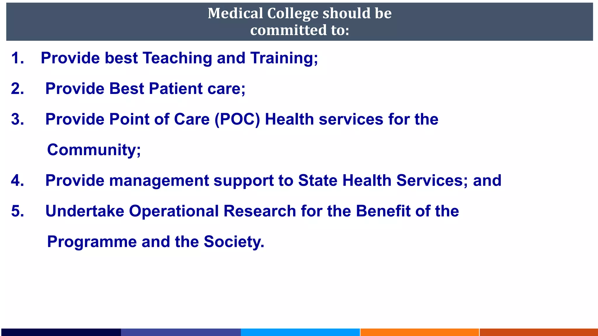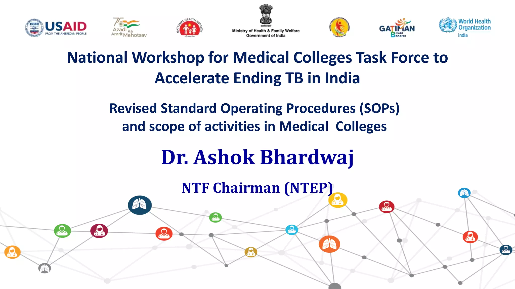 This document outlines the roles and responsibilities of medical colleges in India's National Tuberculosis Elimination Program (NTEP). It establishes task forces at the national (NTF), zonal (ZTF), and state (STF) levels to coordinate activities between medical colleges and NTEP. The STF will facilitate establishing diagnostic and treatment centers, laboratories, and training in medical colleges. Medical colleges are expected to provide TB diagnosis, treatment, preventive therapy, advocacy, training, decentralized drug-resistant TB care, research, and public health support. Private provider engagement, active case finding, and making field areas TB-free are also roles of medical colleges. Standard operating procedures provide guidelines for constituting STFs and their
