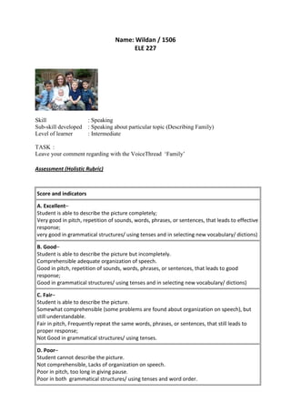 This document provides an assessment rubric for evaluating a student's speaking skills when describing their family in a VoiceThread activity at an intermediate English proficiency level. The rubric assesses pronunciation, fluency, initiation, and language use across 5 levels from excellent to poor. Key areas of evaluation include pronunciation and accuracy, fluency in terms of cohesion/coherence and speed of delivery, and use of grammar and vocabulary appropriate for the level. Scores and indicators are provided for each assessment category.