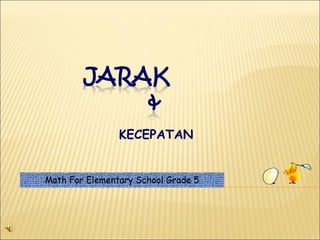 Dokumen tersebut membahas tentang kecepatan dan jarak dalam pelajaran matematika untuk siswa sekolah dasar kelas 5. Materi tersebut menjelaskan rumus dan contoh soal kecepatan, jarak, dan waktu; serta mengajarkan cara menghitung kecepatan, jarak, dan waktu jika diketahui dua variabel. Dokumen tersebut juga berisi latihan soal untuk menguji pemahaman siswa.