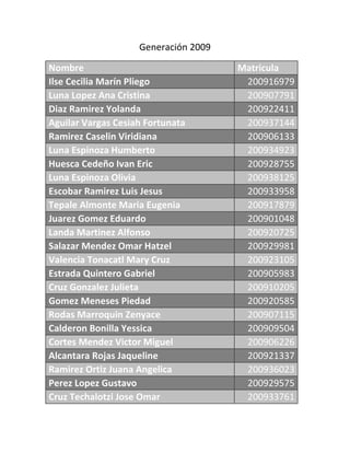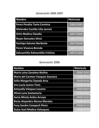 The document contains lists of names and student identification numbers for different generations of students from 2006 to 2011. It also includes a section titled "Seleccionados Biblioteca" with additional names and identification numbers.