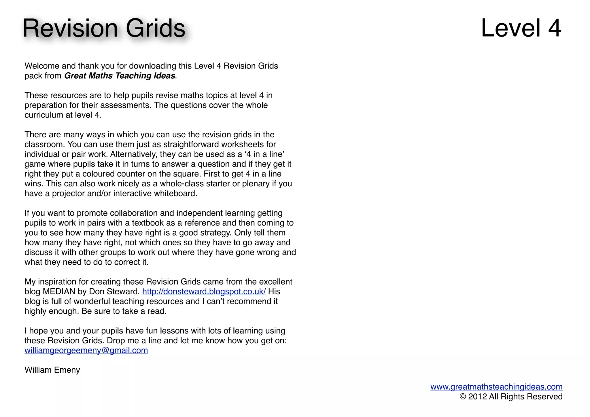 This document provides information about revision grids for level 4 math topics. It includes a welcome message and instructions on how the grids can be used for revision and assessment. Suggestions are given for using the grids in class individually, as a game, or to promote collaboration. The source of inspiration for the grids is cited. Users are encouraged to provide feedback on how the grids are used.