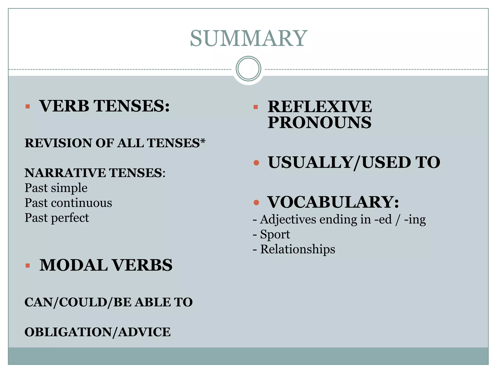 This document provides a revision of verb tenses, modal verbs, reflexive pronouns, and vocabulary. It reviews narrative tenses like the past simple and past perfect, modal verbs for obligation and advice, and how to use reflexive pronouns and adjectives ending in -ed and -ing. Key vocabulary covered includes related to sports, relationships, and emotions.