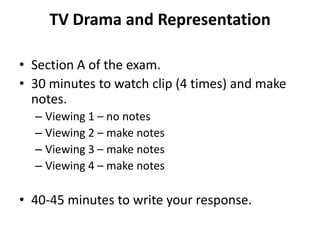 This document provides guidance on analyzing representations in TV drama through close analysis of film techniques. It outlines the exam structure, with 30 minutes to watch a clip and make notes and 40-45 minutes to write a response. It emphasizes using examples to analyze how camera shots, angles, movement, composition, editing, mise-en-scene, and sound construct representations of characters. It provides tips on note-taking and relating techniques to narrative, genre and representations. Key terms are defined to aid analysis, such as protagonists, antagonists and binary oppositions.