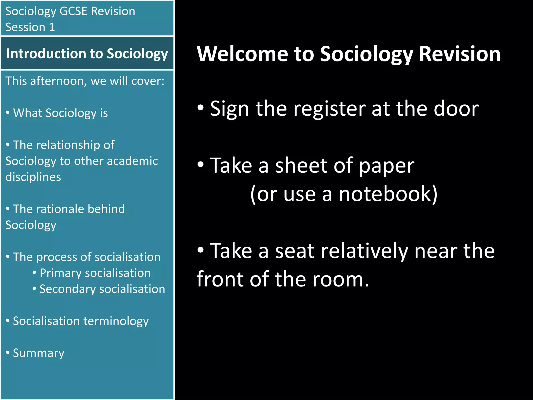 This document provides an overview of key topics that will be covered in a sociology GCSE revision session, including definitions of sociology, socialization, primary and secondary socialization, and sociological terminology like canalization and appellation. The session will examine what sociology is, its relationship to other disciplines, the rationale behind it, and processes of socialization.