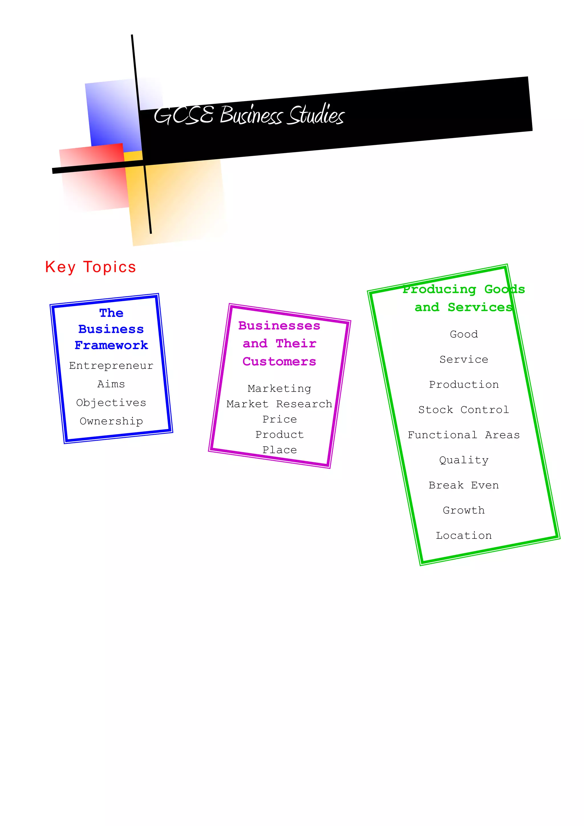 This document outlines the key topics covered in a GCSE Business Studies course, including producing goods and services, businesses and their customers, marketing, production, ownership, and growth. It also mentions topics like price, product, place, promotion, quality, break even, location, international business, and the European Union.