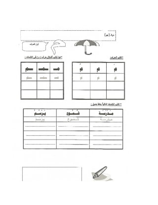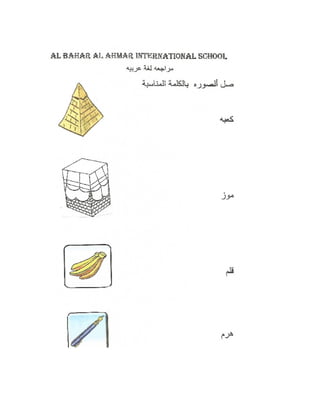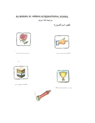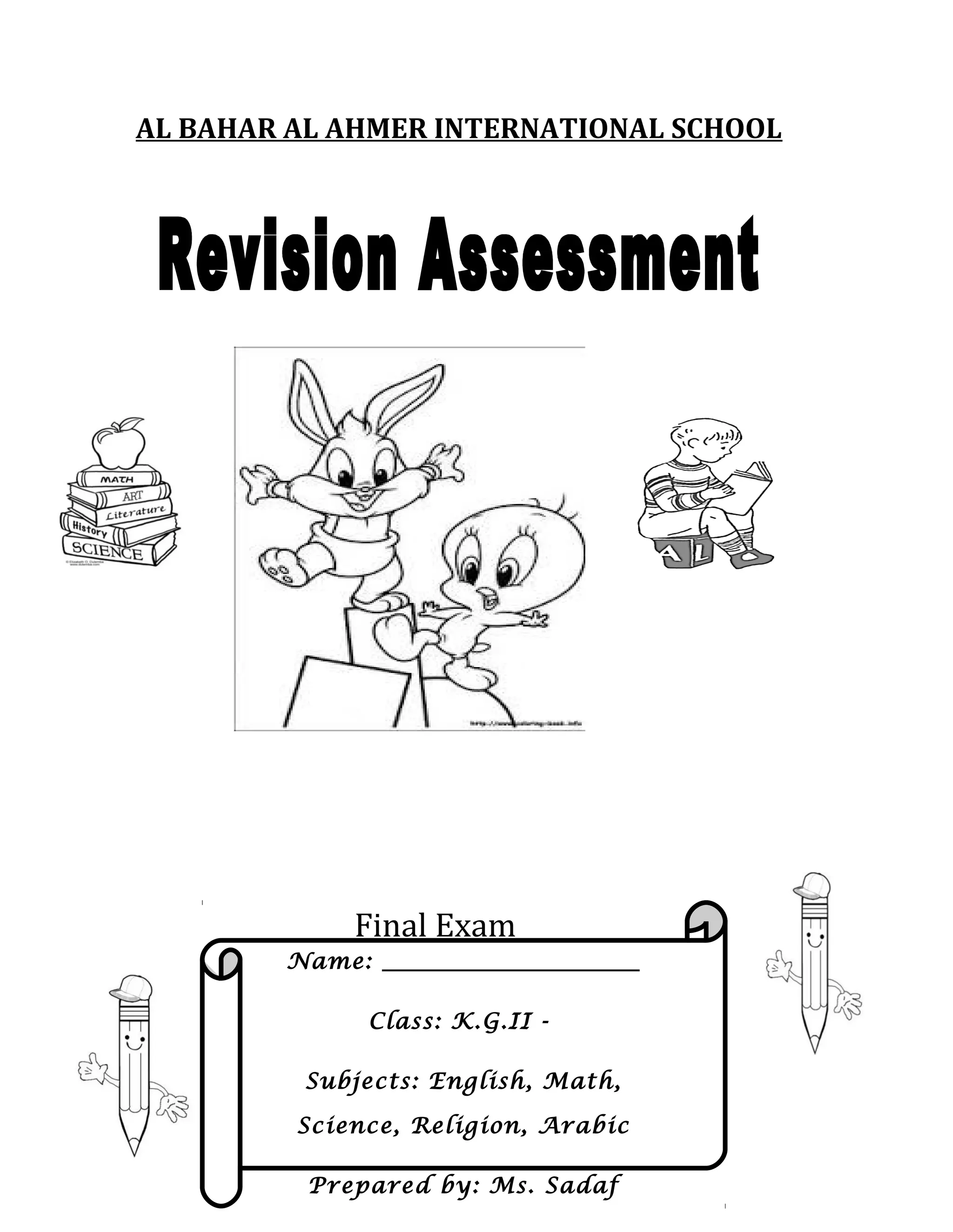 This document appears to be a final exam for a kindergarten class covering several subjects: English, math, science, religion, and Arabic. It includes exercises like writing letters, numbers, labeling pictures, matching, filling in blanks, coloring and more. The content covers topics like animals and their homes, parts of the day, traffic lights, safety, and the five pillars of Islam. It was prepared by Ms. Sadaf for the final exam at Al Bahr Al Ahmar International School.