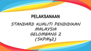 Dokumen ini membahas pelaksanaan Standard Kualiti Pendidikan Malaysia Gelombang 2 (SKPMG2) yang meliputi lima standard utama terkait kepemimpinan, pengurusan organisasi, pengurusan kurikulum, pembelajaran, dan kemenjadian murid. Terdapat penekanan pada penggunaan metodologi yang terencana dan evidens dari pelaksanaan bagi memastikan pengoptimuman potensi murid serta keberkesanan pendidikan. Tindakan untuk mencapai setiap standard diuraikan dengan jelas melalui kriteria kritikal dan rubrik penskoran yang menetapkan tahap kualiti pelaksanaan.
