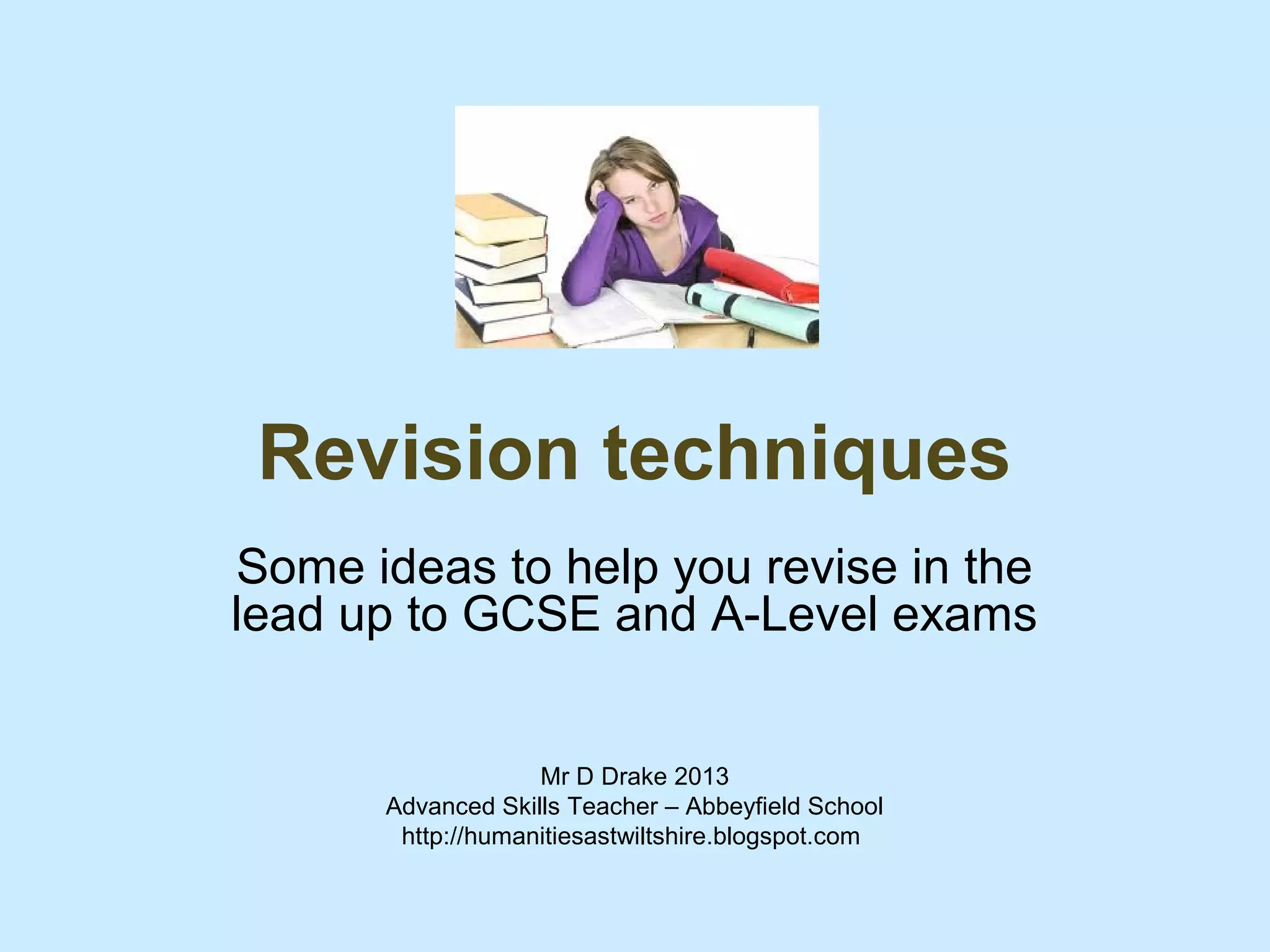 This document provides several techniques for revising for GCSE and A-Level exams, including: