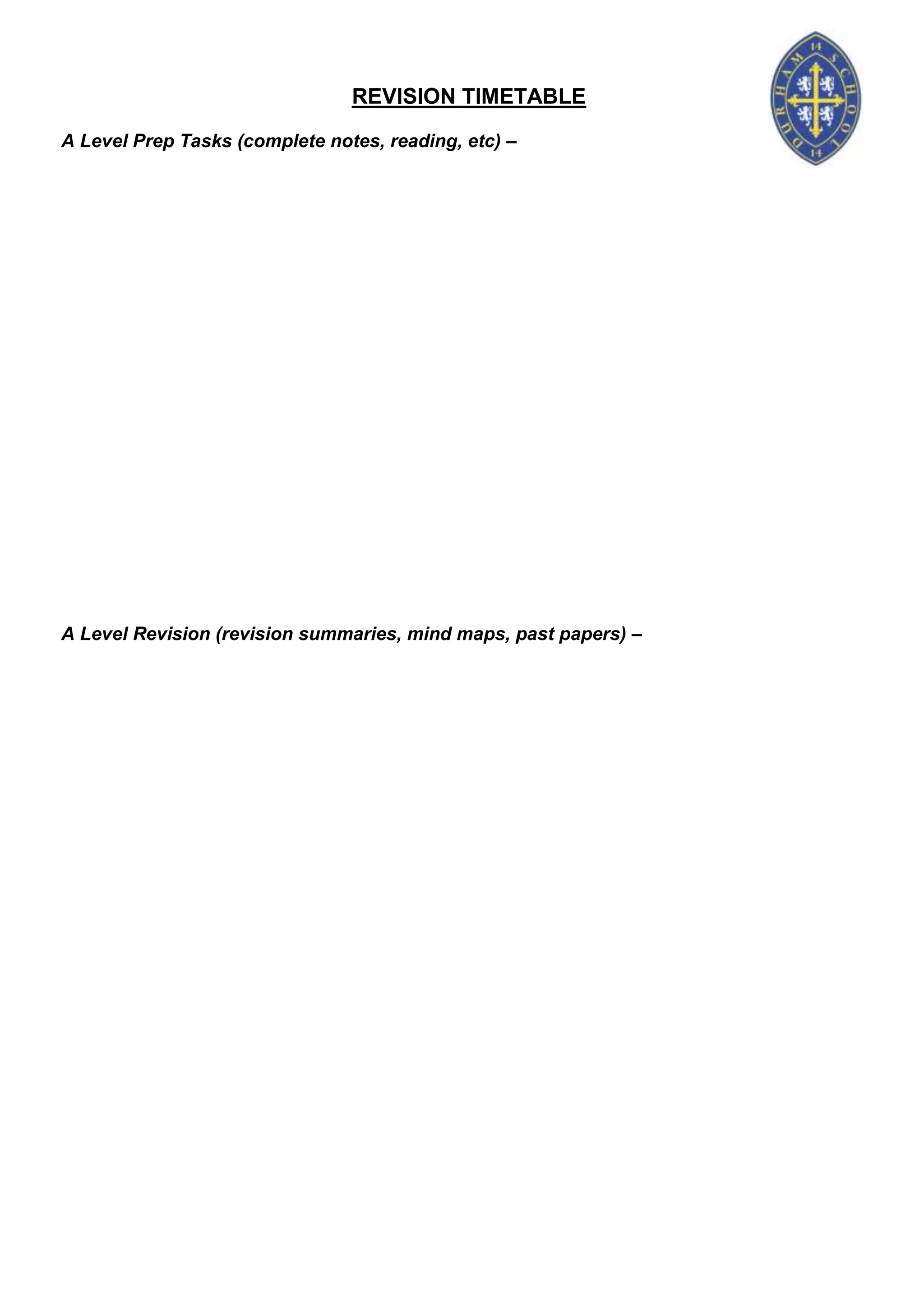 The document contains a revision timetable for Easter 2013 for A Level preparation. It includes 3 weekly schedules outlining time blocks from 9am to 8pm+ each day for activities like completing notes and readings, revision summaries and past papers to prepare for A Level exams over the Easter break.
