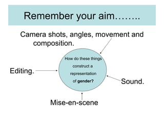 This document provides guidance for analyzing how elements of film technique like camera work, editing, sound, and mise-en-scene are used to represent aspects of characters like their gender, social class, or nationality. It instructs the reader to analyze a clip and note what each element reveals about the characters and then explain it in terms of the filmmaking techniques. The reader is also reminded to consider how all of these elements work together to tell us something about the characters.
