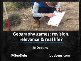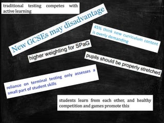 This document discusses using games and active learning techniques for geography revision and lessons as alternatives to traditional testing which may compete with active learning. It provides examples of hands-on activities like jigsaws, edible learning, experiments, Minecraft, board games, Lego graphs, and tech-based tools like collaborative documents and quizzes that make learning more engaging for students by allowing them to learn from each other through competition and games. The author questions whether there is still a place for more messy and games-based learning given exam pressure but provides the examples as potential alternatives or additions to traditional learning.
