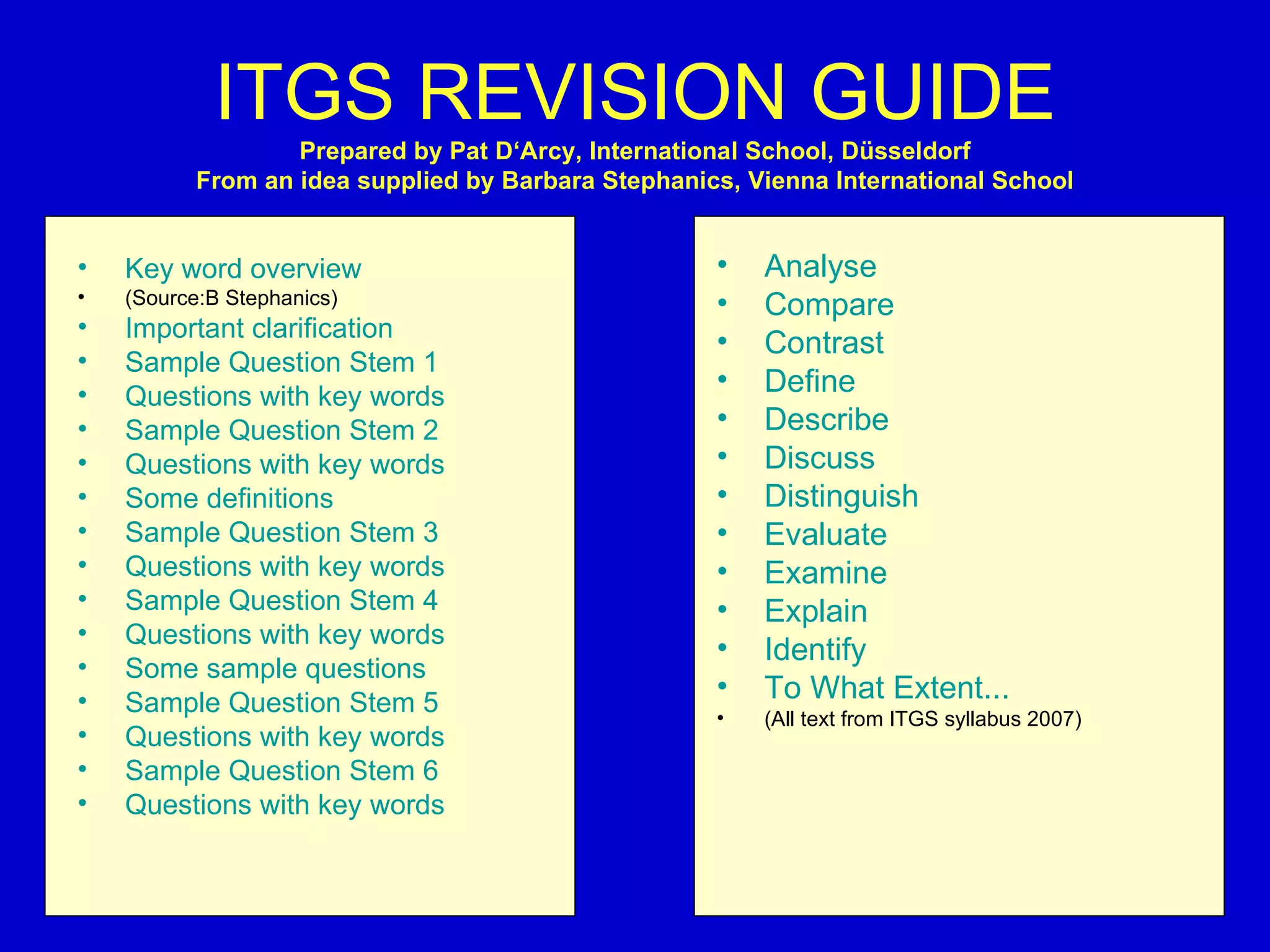 The document is an ITGS (Information Technology in a Global Society) revision guide that provides sample exam questions organized by key terms. It includes sample question stems with blanks to be filled in, definitions of key terms like "discuss" and "evaluate", and sample multi-part questions addressing topics like mobile computer labs, call centers, computer networks, and online banking. The guide aims to help students understand different question types and organize their exam responses.