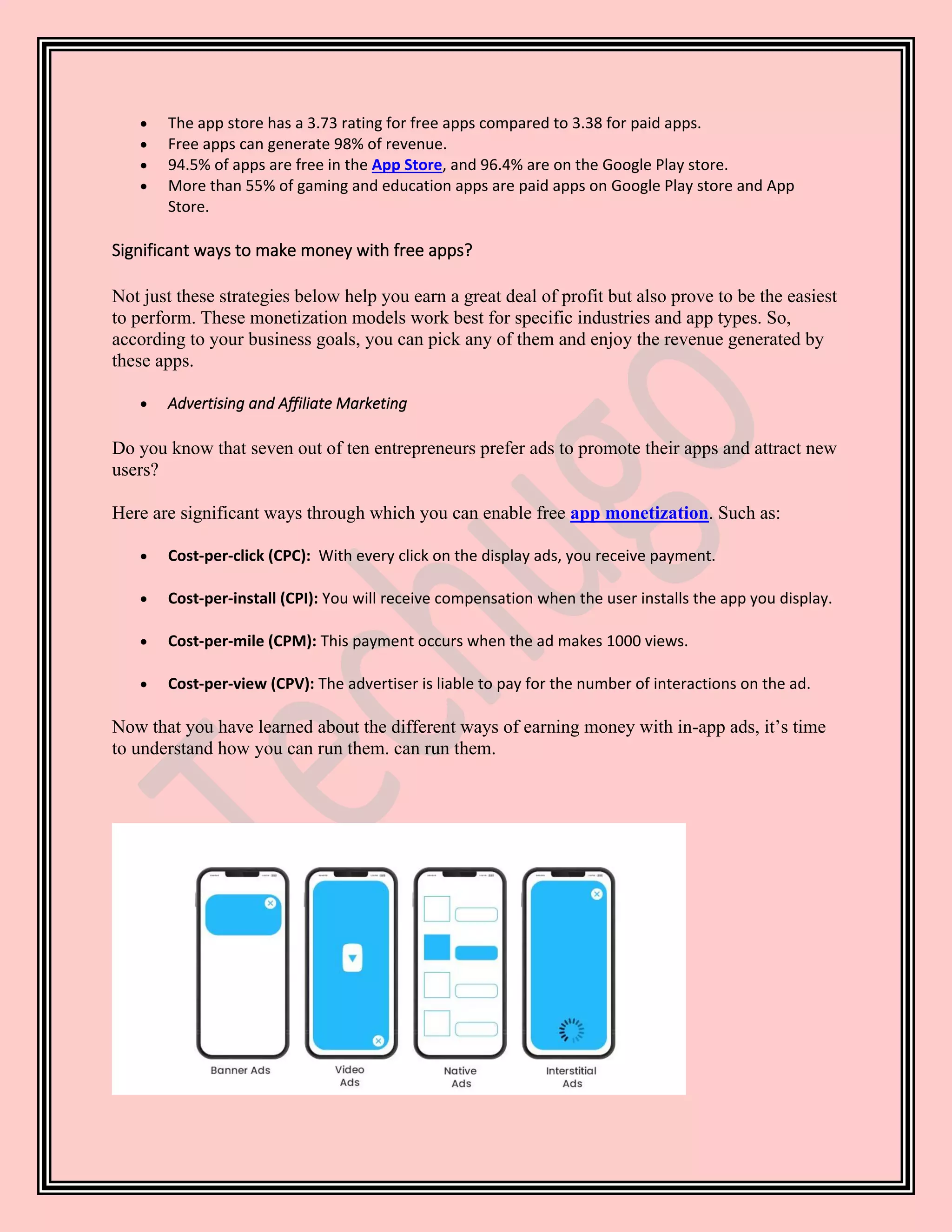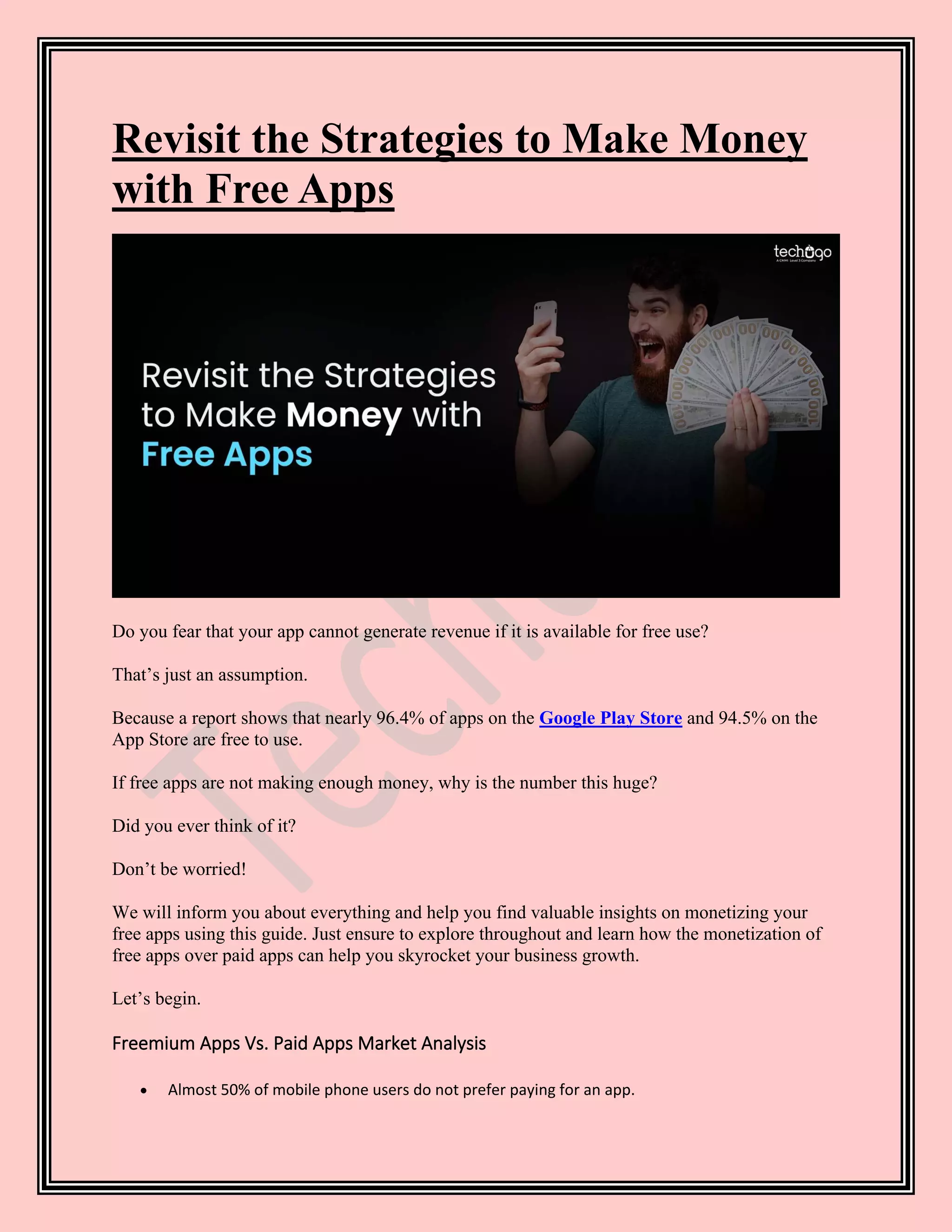 The document explores various strategies for monetizing free apps, highlighting that a significant majority of apps are offered for free yet still generate substantial revenue through methods like advertising, in-app purchases, and subscription models. Key points include the effectiveness of freemium upsells and the importance of understanding target audiences and business goals to choose appropriate monetization strategies. The text concludes by emphasizing the continuous opportunities for revenue generation from free apps through diverse monetization tactics.