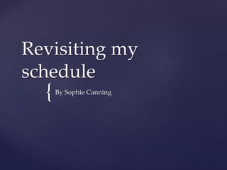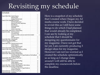 Sophie Canning revisits her schedule for her A2 media coursework. She created an optimistic schedule initially but has fallen behind on some tasks like designing her questionnaire. She updates her schedule by changing dates around and sees she has approximately 12 more tasks to complete along with her evaluation by her deadline of April 23rd, allowing enough time to finish her coursework.