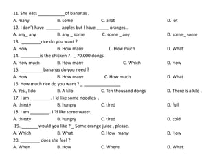 The document contains a list of 100 multiple choice questions testing English grammar and vocabulary. The questions cover a range of topics including quantities, food and drinks, locations, daily activities, jobs, weather, time expressions, and parts of speech. The correct answer is provided for each question, with the answers ranging from single words to short phrases.