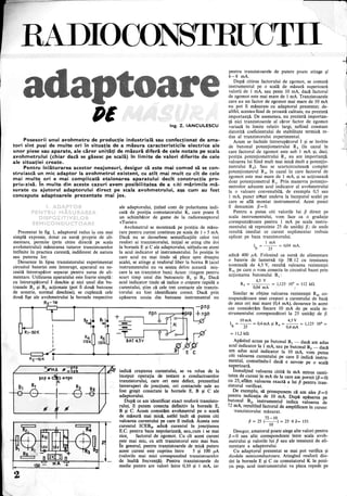 Documentul descrie construirea unui adaptor pentru avohmetre, care permite utilizatorilor să măsoare caracteristicile electrice ale tranzistoarelor și altor componente electrice de diverse tipuri, facilitând citirea directă a valorilor pe scala avohmetrului. Adaptorul este dotat cu o sursă de alimentare proprie, iar utilizarea sa este explicată pas cu pas, inclusiv identificarea reuforilor tranzistorului și calcularea curentului de zgomot. De asemenea, documentul menționează posibilitatea de a măsura frecvențele audio și de a verifica diodele și tiristoarele cu ajutorul adaptorului.