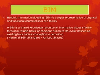 The document outlines the features and functionalities of Revit Architecture 2013, a Building Information Modeling (BIM) software used for architectural design. It covers various aspects of the software, including 3D modeling, creating views, modifying elements, dimensioning, and rendering projects. Additionally, the document provides insights into workshops offered, hardware requirements, and details on working with families and project files.