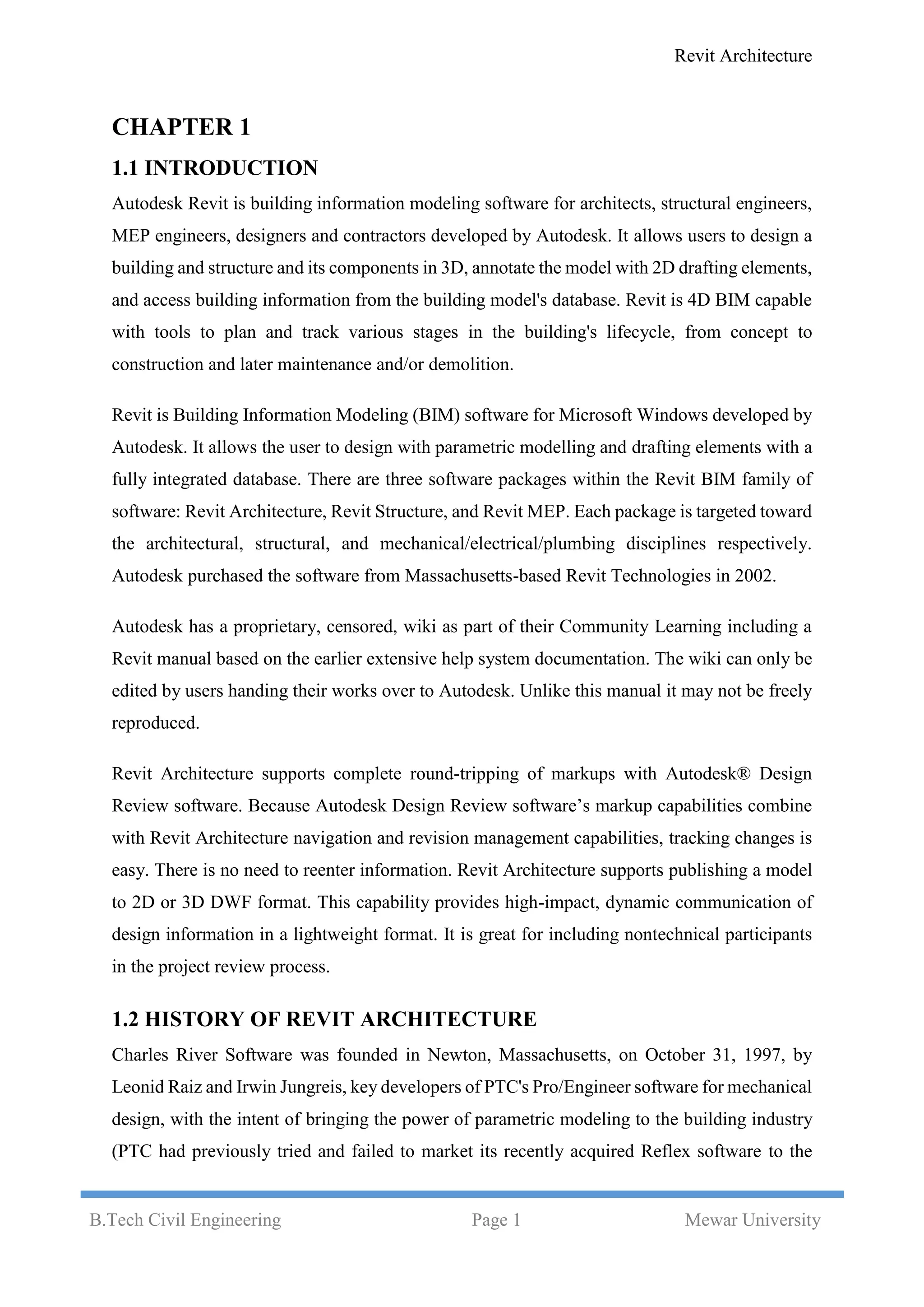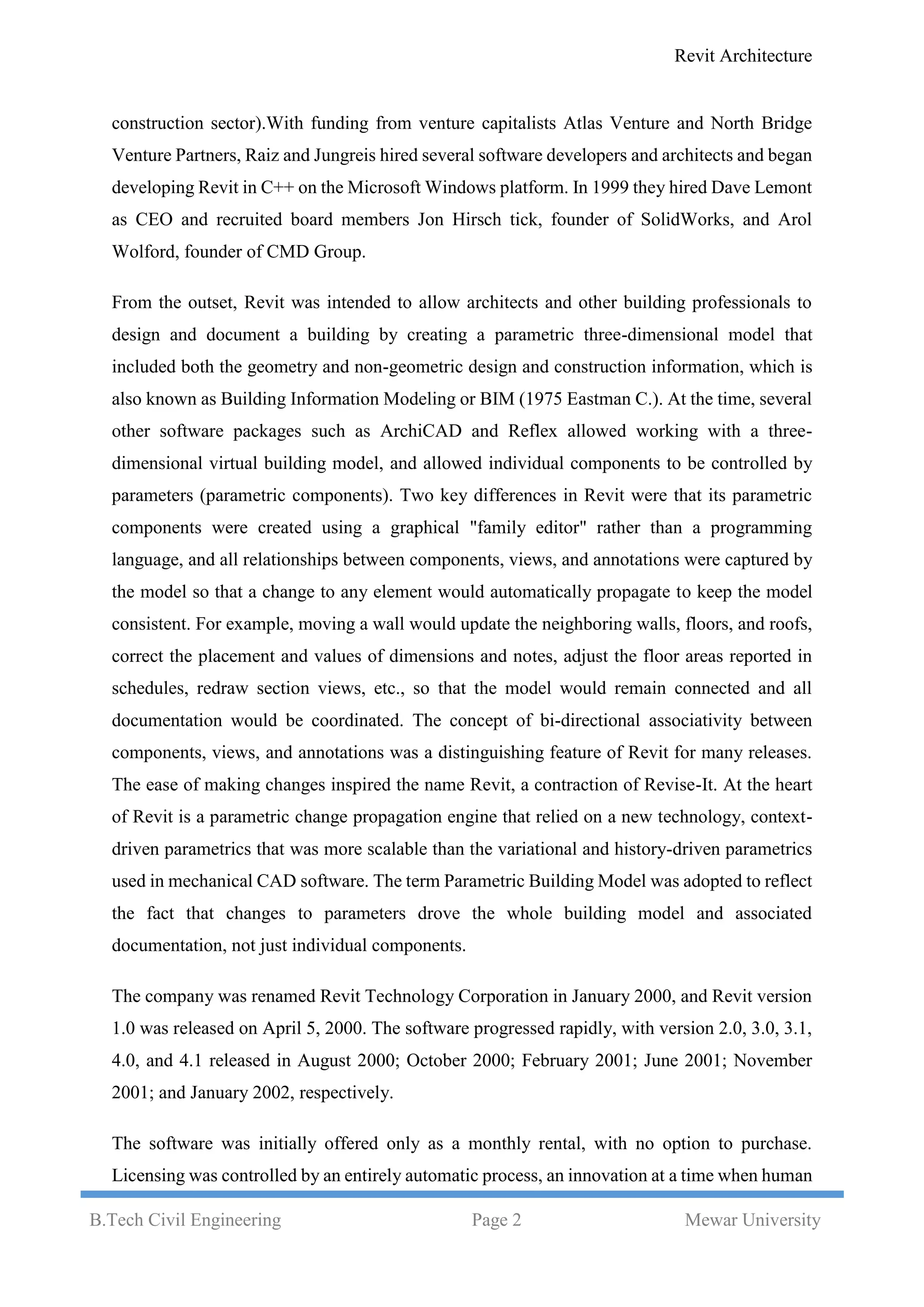 Revit is building information modeling (BIM) software developed by Autodesk for architects, engineers, and contractors. It allows users to design buildings in 3D, annotate models, and access building information. Revit was originally created by Charles River Software in 1997 and was later acquired by Autodesk in 2002. There are three main versions: Revit Architecture, Structure, and MEP, each targeted towards different disciplines. Revit uses parametric modeling which allows elements to be controlled by parameters and automatically updates the model based on changes.