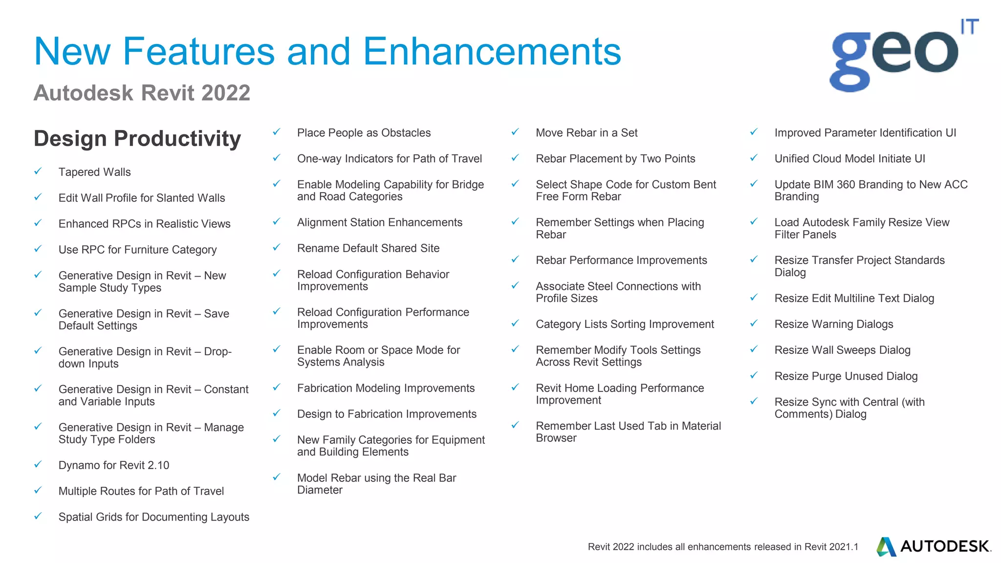 Revit 2022 includes several new features and enhancements to improve productivity for designers including: tapered and slanted wall modeling, enhanced realistic rendering of families, improved generative design tools, enhanced route analysis functionality, expanded infrastructure modeling capabilities, improved systems analysis reporting, and various rebar modeling enhancements. The update also includes performance and usability improvements across multiple areas of Revit.