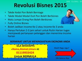 Tawaran bisnes tanpa modal dan risiko yang menjanjikan keuntungan tinggi dengan permintaan tinggi tetapi terhad hanya untuk 10 orang pertama. Bisnes sepenuhnya atas talian yang hanya memerlukan 2-3 jam sehari. Peluang mendapat akses percuma kepada produk laris dan rahsia pelanggan kaya. Sesuai untuk mereka yang baru menceburi dunia perniagaan kerana latihan pemasaran dan teknik diberikan percuma.