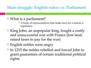 The document summarizes the revolution in England that established parliamentary rule over absolute monarchy. It began when King John faced a rebellion from nobles in 1215, forcing him to agree to the Magna Carta which established basic legal rights and limited royal power. This led to the development of institutions like common law, due process, habeas corpus and an increasingly powerful Parliament that sought to restrict monarchs' authority. This conflict continued until the Glorious Revolution of 1688 established England as a constitutional monarchy with Parliament drafting the Bill of Rights to define the powers of monarch and parliament. A cabinet system developed where government ministers answered to Parliament rather than the monarch, establishing the prime minister as head of the ruling party.