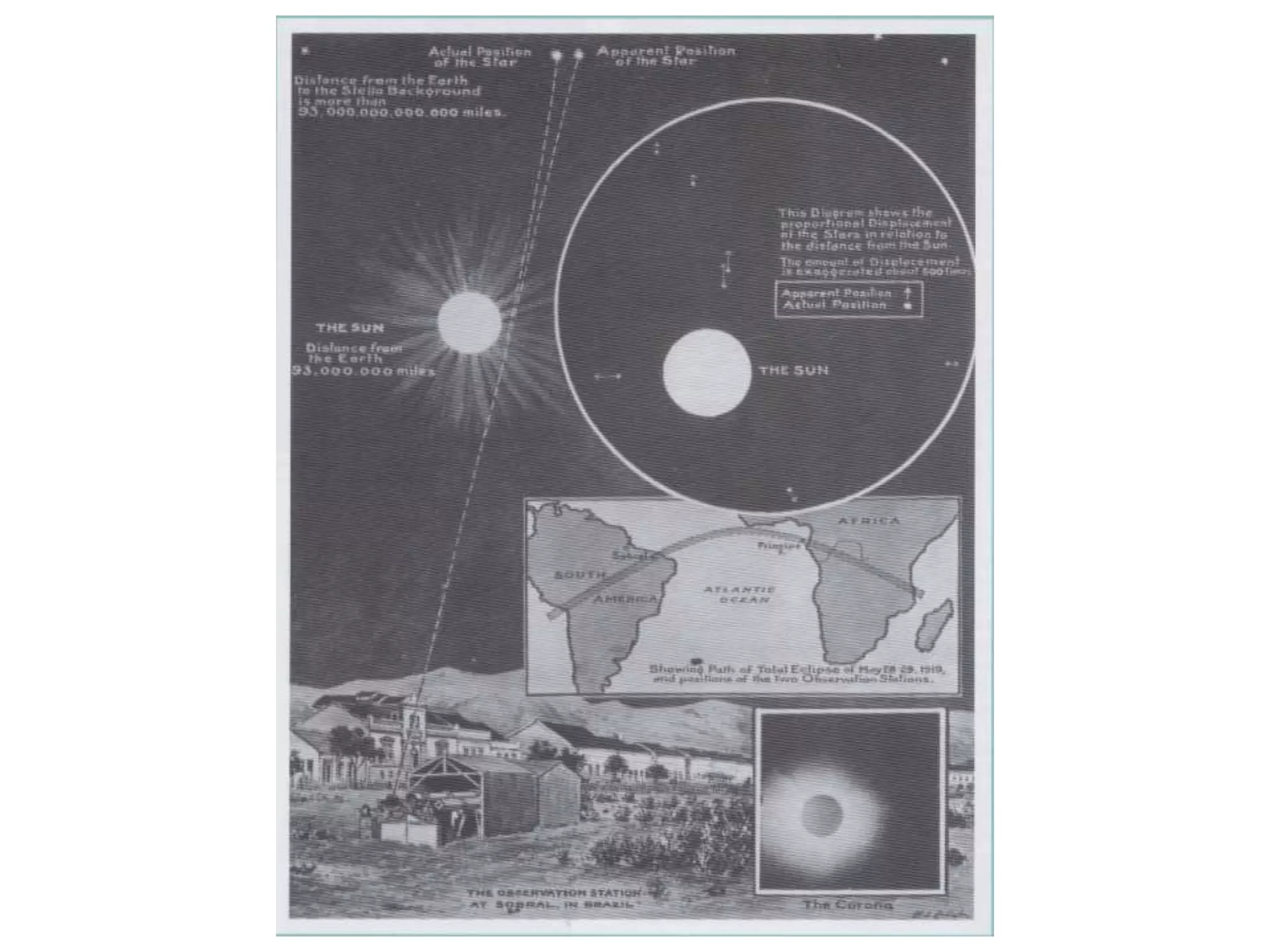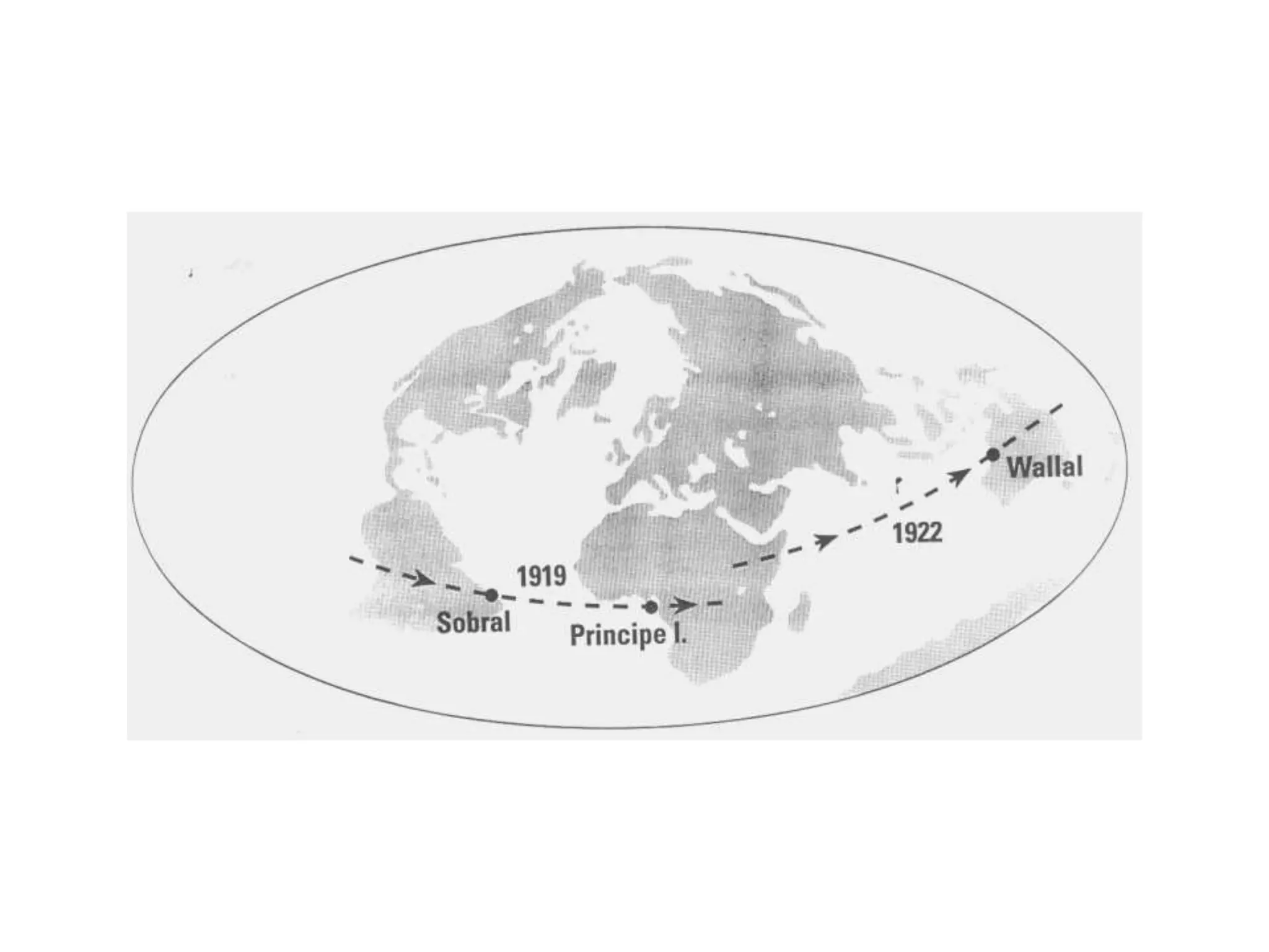 1) In 1919, expeditions led by Eddington to Principe and Crommelin to Sobral measured the bending of starlight by the Sun during a solar eclipse to test Einstein's theory of general relativity, which predicted light bending would be twice that of Newton's prediction.