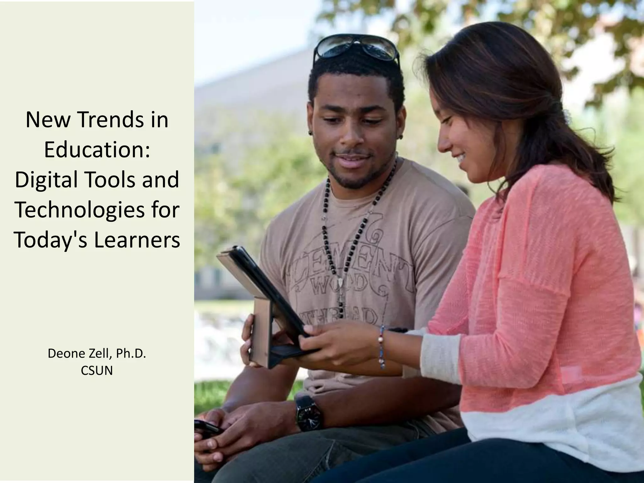 This document discusses new trends in education with the rise of digital tools and technologies. It notes that today's students are "digital natives" who have grown up with technology like smartphones, tablets, social media and can retrieve information quickly. It outlines how tools like lecture capture, eTexts, tablets and content creation are being used at CSUN. It also discusses how technologies are changing areas like user interfaces, devices, communications, education and more. The document concludes that technology is radically changing the way we work, learn and play, and that students are demanding more multimedia and mobile options, transforming the role of higher education.