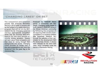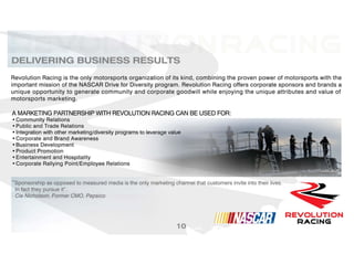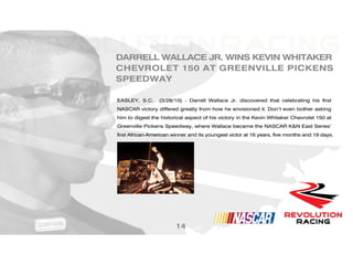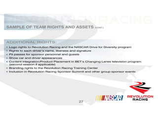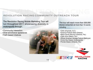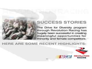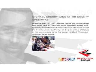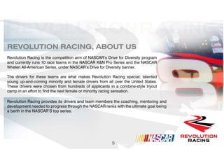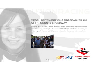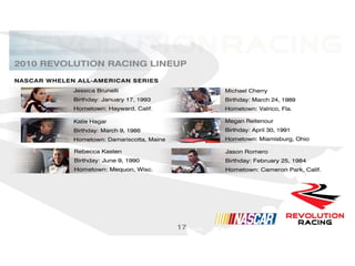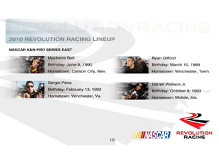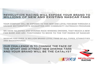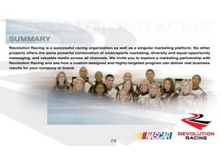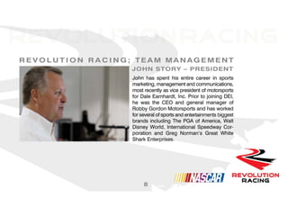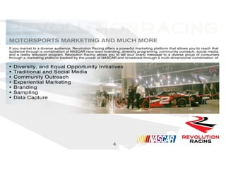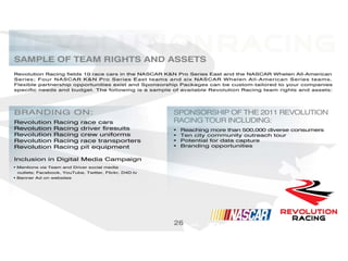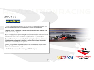 Revolution Racing is looking for sponsors for their upcoming racing season. Potential sponsors should contact Wade Leaphart via email at Wade@revolutionracing.net or by phone at 704-247-8505 to discuss sponsorship opportunities. Revolution Racing has competitive cars and experienced drivers who would represent any sponsor well at races.