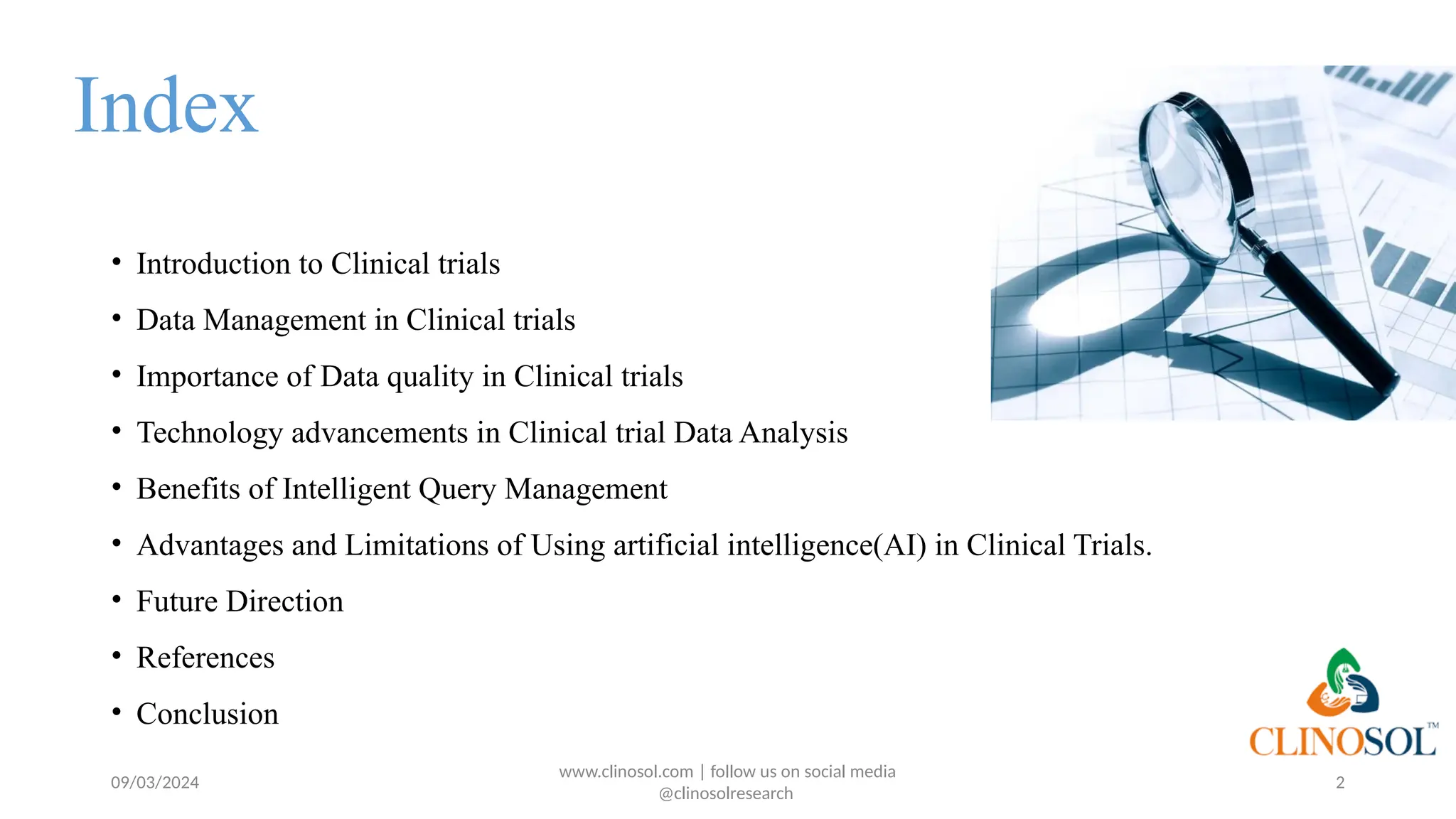 The document discusses the revolutionizing of clinical trial data quality through intelligent query management and emphasizes the importance of data accuracy and integrity. It highlights advancements in technology such as AI, blockchain, and natural language processing, which enhance data management and streamline processes. The future direction includes patient-centric trials, real-world evidence, and decentralized clinical trials, positioning technology as a key facilitator of progress in clinical research.